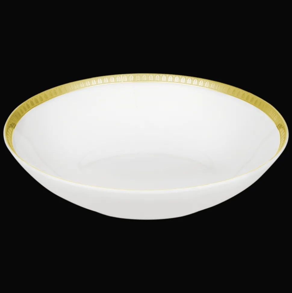 Assiette crueuse à calotte en porcelaine de Limoges dorée à l’or fin pour une table élégante et signée. Le décor réinterprète les codes identitaires de la collection Malmaison.