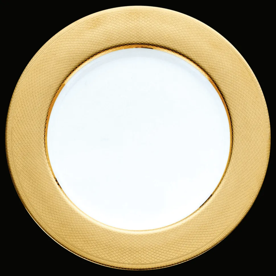 Assiette de présentation en porcelaine de Limoges dorée à l’or fin pour une table élégante et signée. Le décor réinterprète les codes identitaires de la collection Malmaison.