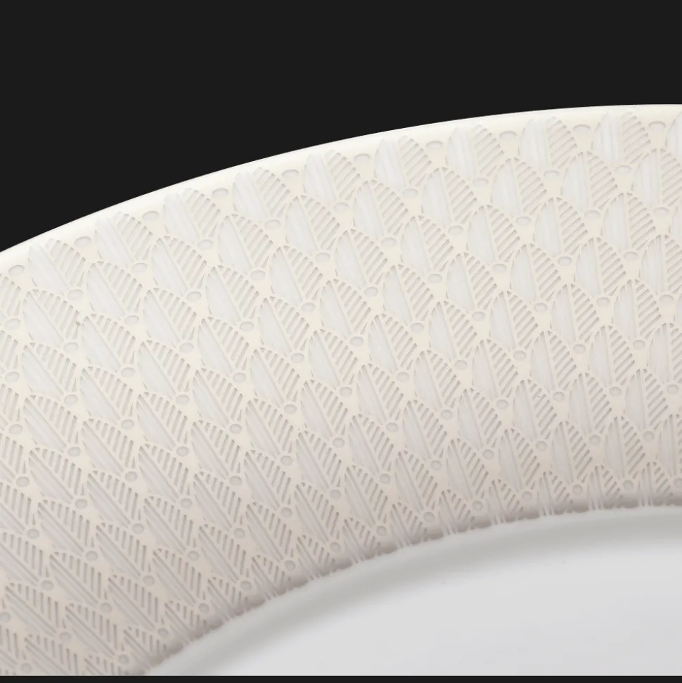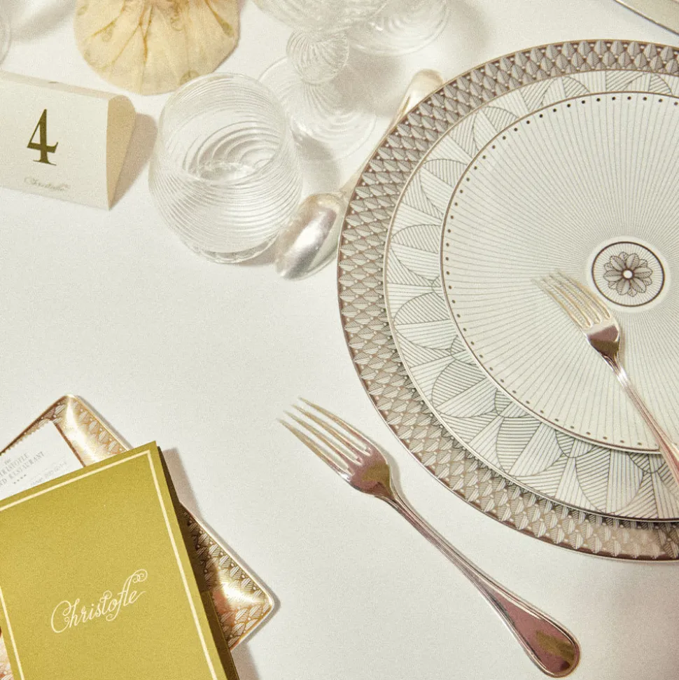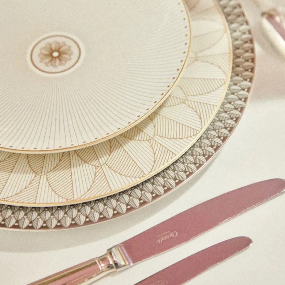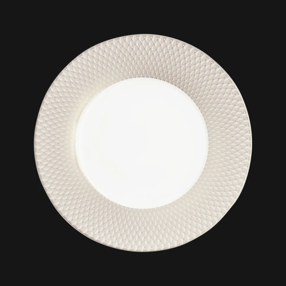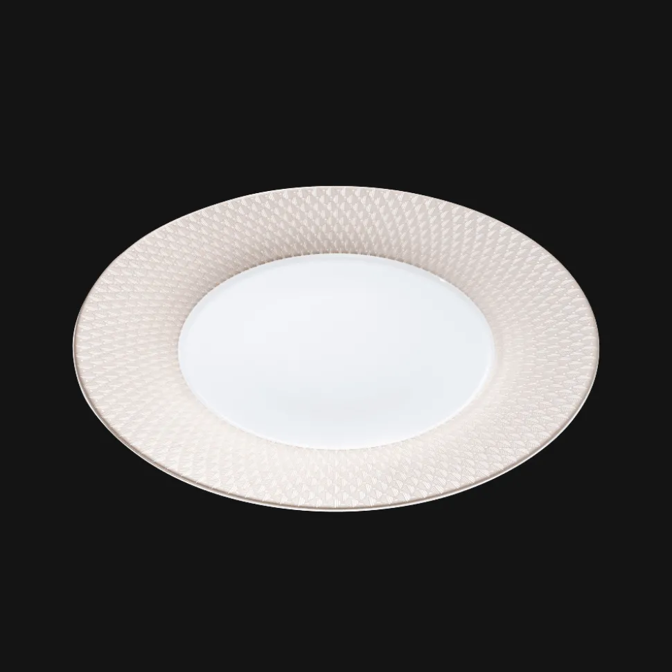 Assiette de présentation en porcelaine de Limoges avec décor platine. L’assiette de présentation vient habiller votre table et sert à accueillir les autres assiettes. Elle ne se retire qu’au moment du fromage.