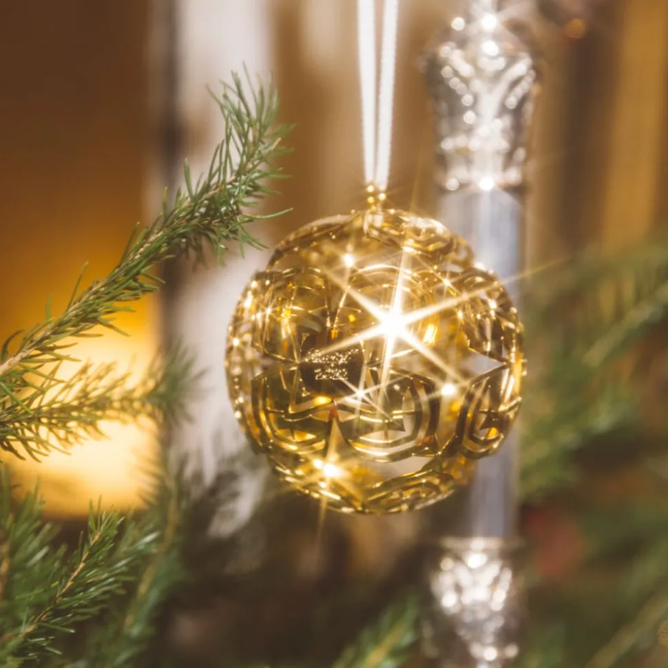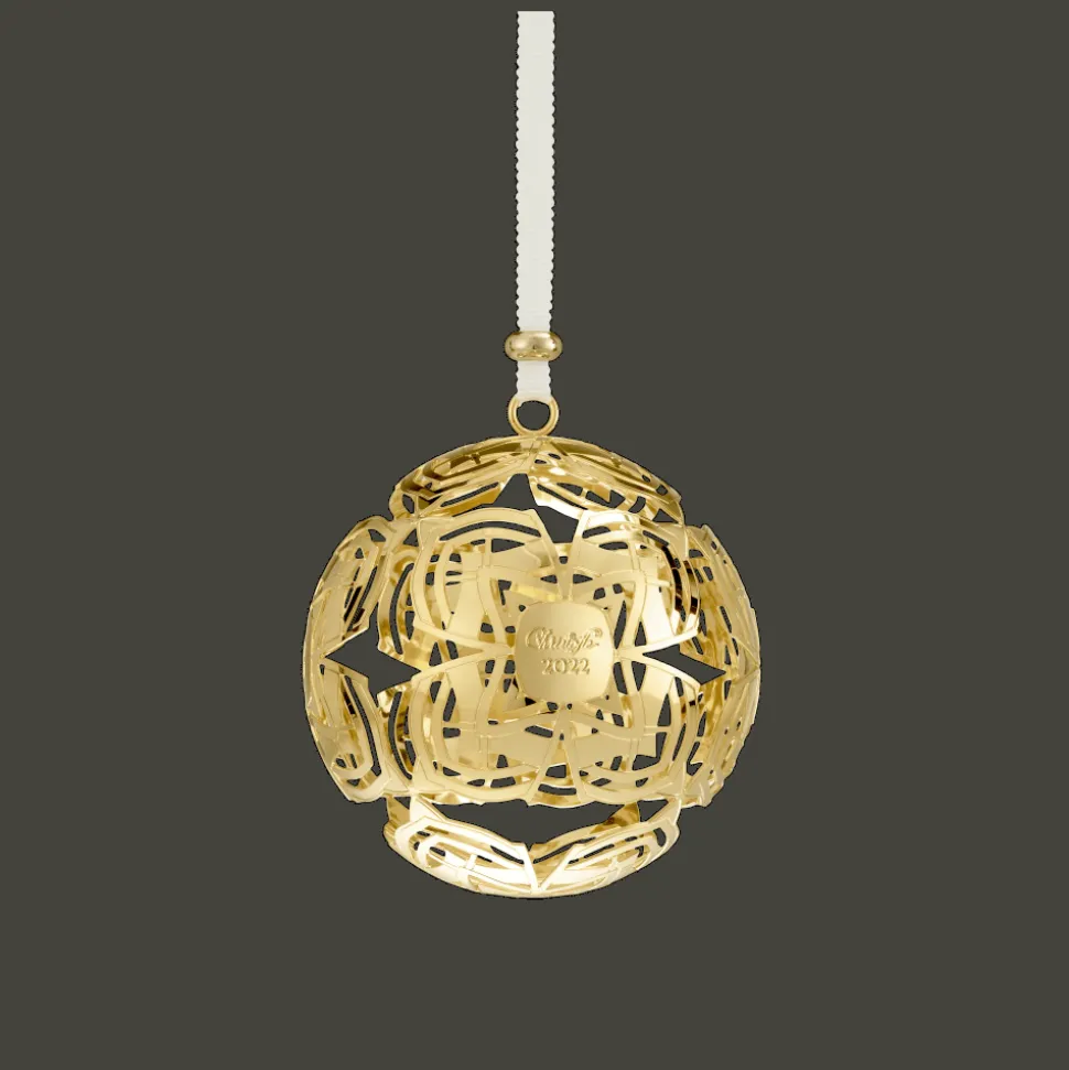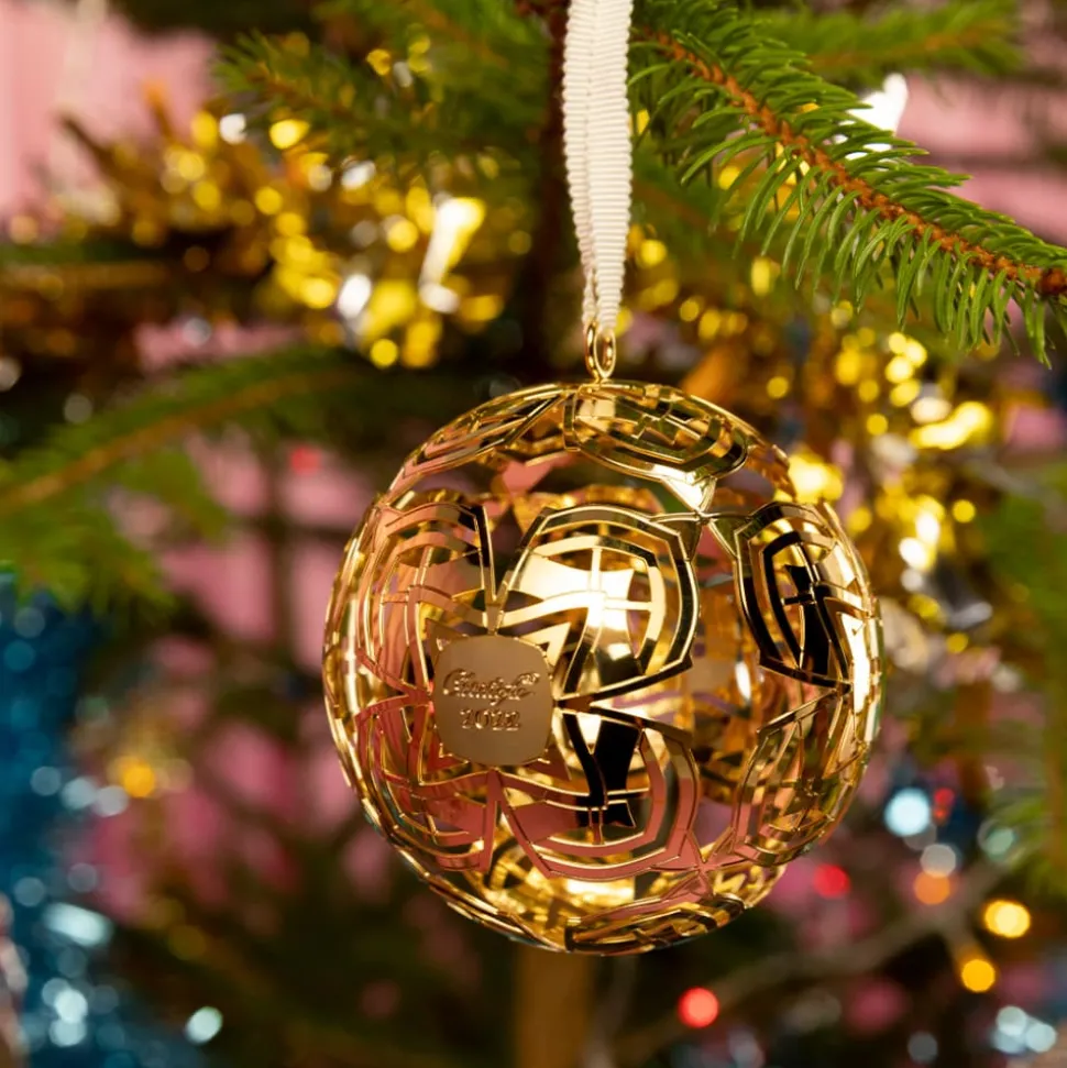 Chaque année pour célébrer les fêtes de fin d’année, Christofle propose différents ornements dont une boule de Noël en métal argenté et pour la première fois une version dorée. Chaque boule millesimée 2022 est vendue avec un ruban ivoire gros grain et une perle en acier dorée. Un motif qui illustre parfaitement l’esprit de Noël pour décorer avec élégance un sapin de Noël ou une cheminée.