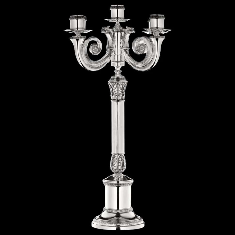 Très beau chandlier en métal argenté 5 branches issue de l’iconique collection de style empire. Objet de décoration intemporel, pour décorer un intérieur classique et raffiné.