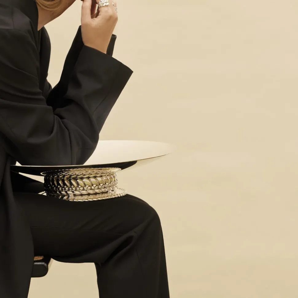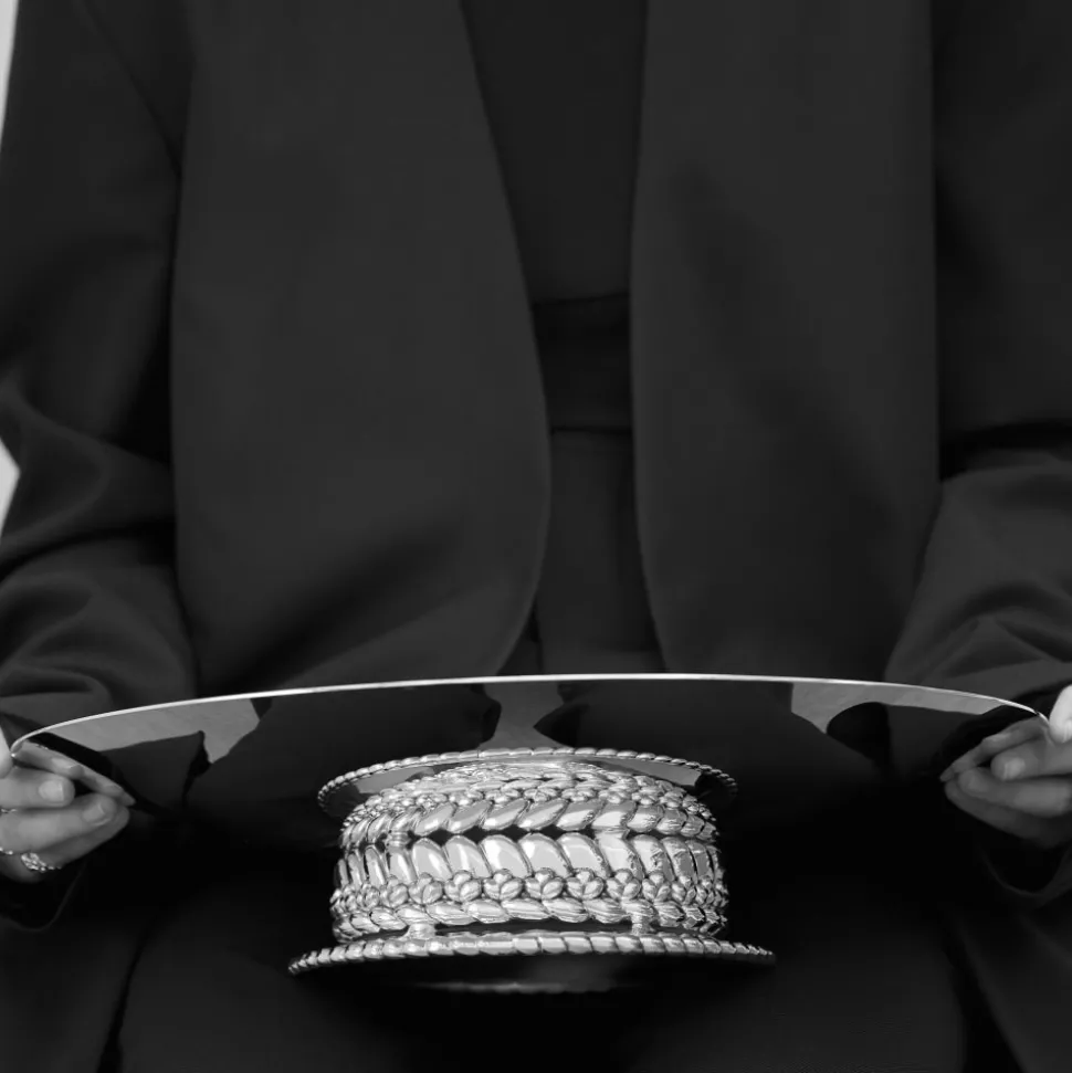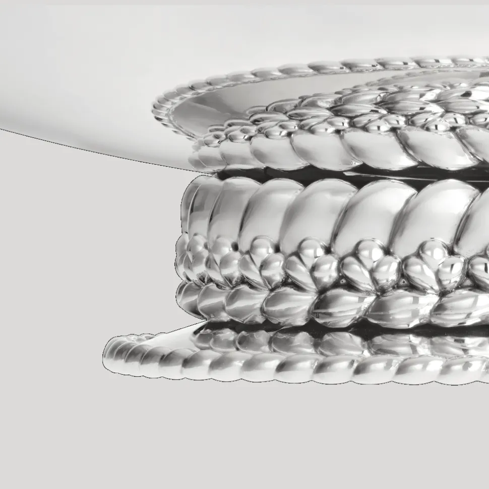 Pièce majestueuse et de caractère, ce centre de table en métal argenté avec sa base tressée se reflétant subtilement dans sa coupe, habille votre table d’une modernité délicate.