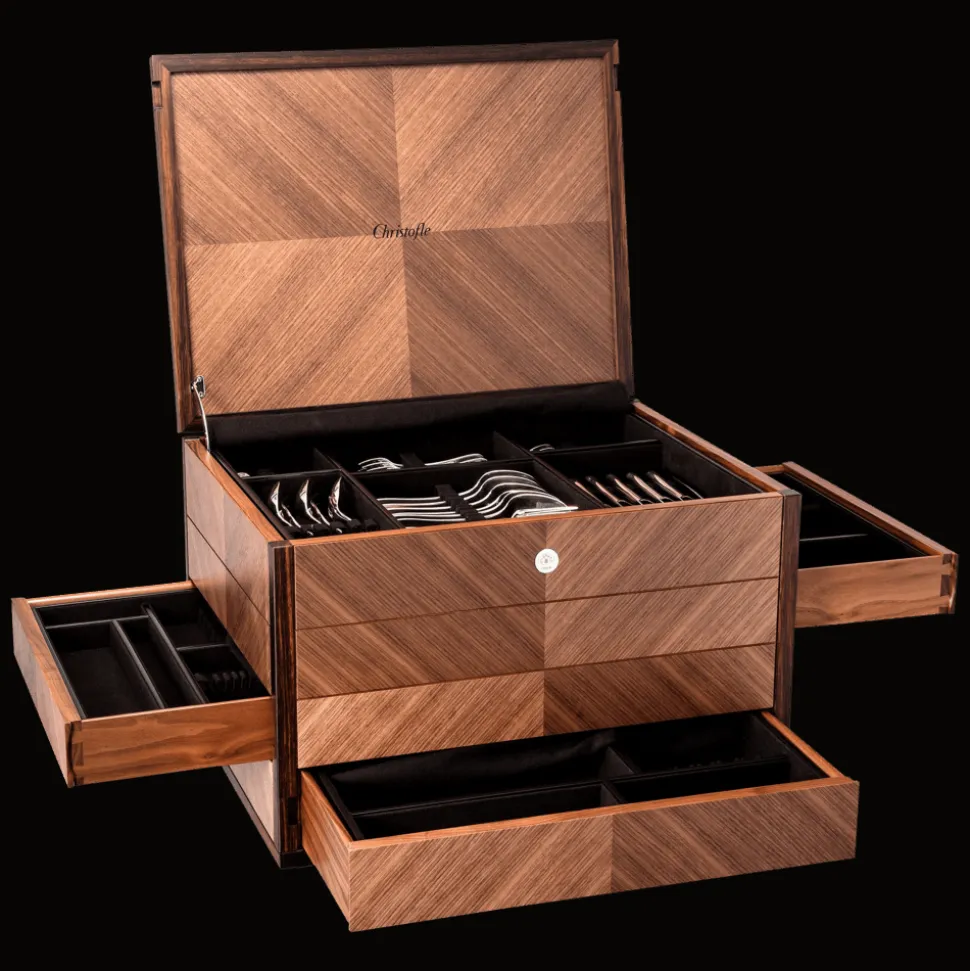 Coffre en marqueterie de bois, noyer et ébène, gainé de suédine et d’un tissu anti-oxydant. Ce coffre peut contenir 165 pièces.