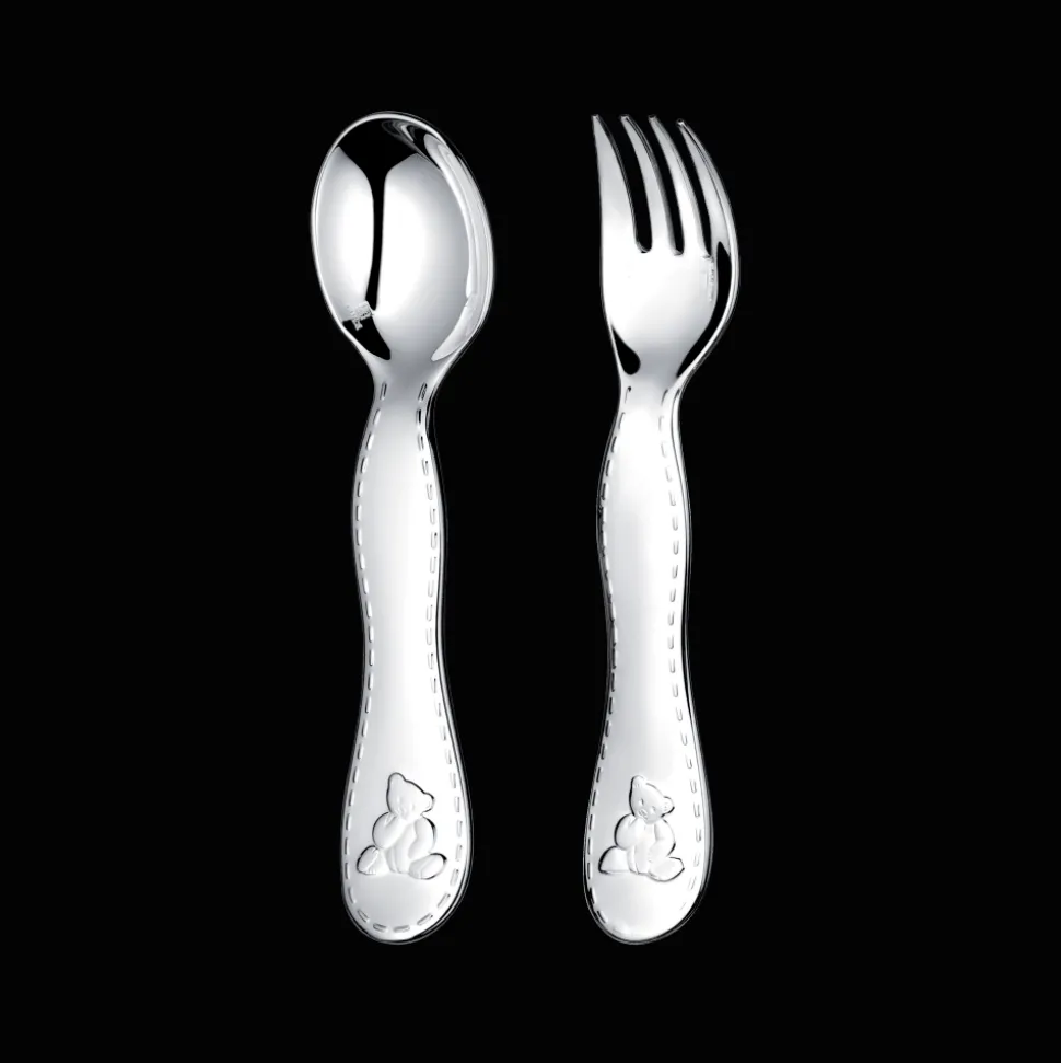 Idéal pour un cadeau de naissance, le set de 2 couverts Charlie Bear composé d’une cuillère et d’une fourchette bébé charmera les tout petits. L’adorable ours Charlie plaira aussi bien aux petites filles qu’aux petits garçons. Cet ensemble de couverts pourra faire l’objet d’un joli cadeau tout au long de la vie de l’enfant : naissance, baptême, anniversaire. La date de naissance, le prénom ou les initiales de l’enfant peuvent être gravés sur les couverts. Les couverts sont livrés dans leur écrin.