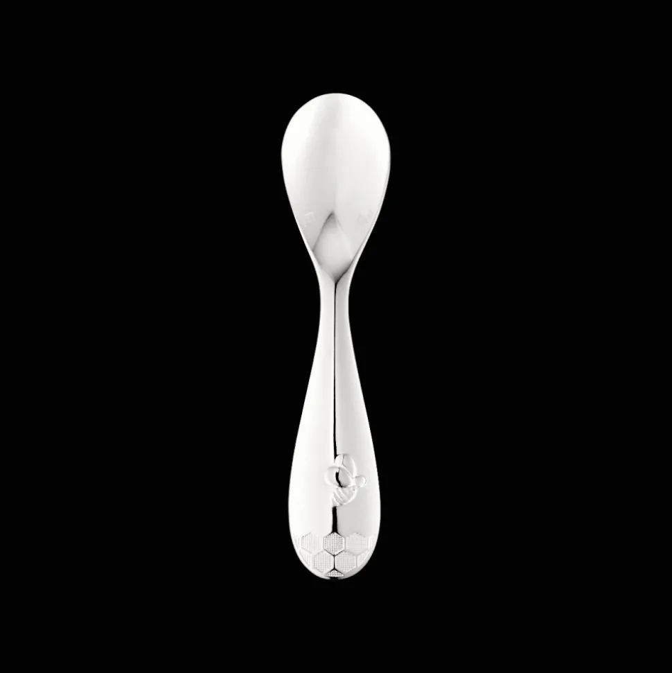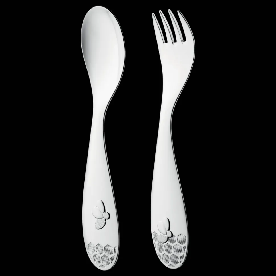 Le coffret de deux couverts contenant la fourchette et la cuillère charmera les tout petits. Emblématique de la collection, le décor imagé avec Beebee semblant voleter au-dessus de sa ruche est à la fois raffiné et ludique. La petite abeille en relief et les hexagones granités éveilleront les sens de bébé lors de ses repas au quotidien. Cet ensemble de couverts pourra faire l’objet d’un joli cadeau tout au long de la vie de l’enfant : naissance, baptême, anniversaire. La date de naissance, le prénom ou les initiales de l’enfant peuvent être gravés sur les couverts. Les couverts sont livrés dans leur écrin.