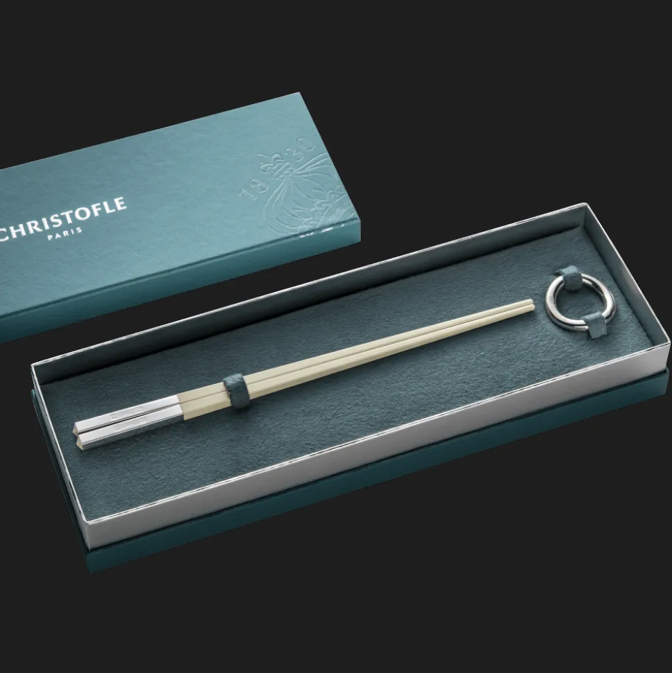 Ce set contient une paire de baguettes chinoises ivoire UNI en résine laquée et métal argenté et d’un pose-baguettes en métal argenté de la collection VERTIGO. Essential cutlery for seizing food in Asia, chopsticks come in different formats depending on their origin. The Chinese chopsticks, often made of bamboo, are long because they allow food to be placed in shared dishes in the center of the table. The Japanese chopsticks are made of lacquered wood, short and with a pointed end, because the food is not shared: each member at the table has his own plate.