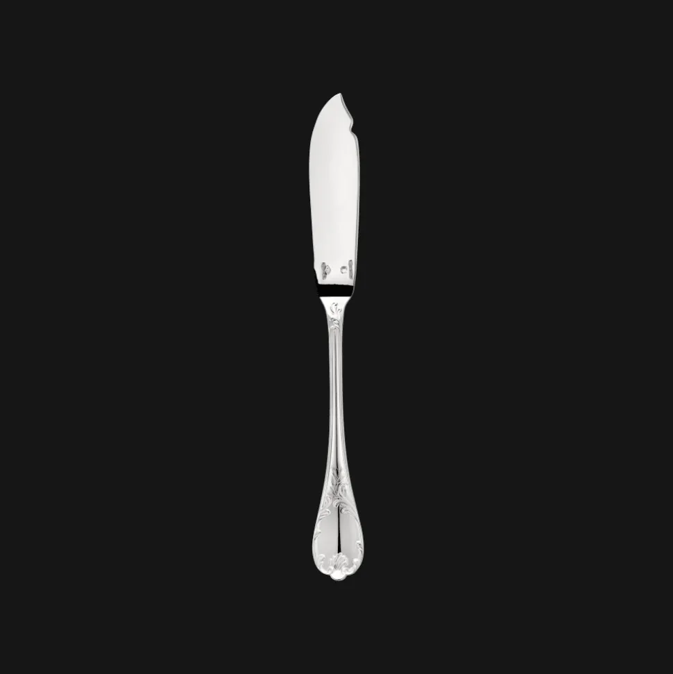 Couteau à poisson en argent massif. Combiné à la fourchette à poisson, il est utile pour détacher la chair de poisson des arrêtes et la soulever.