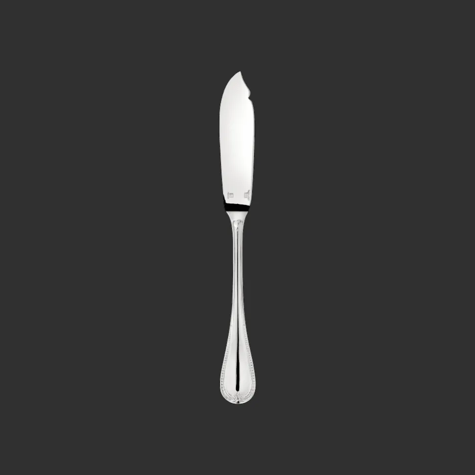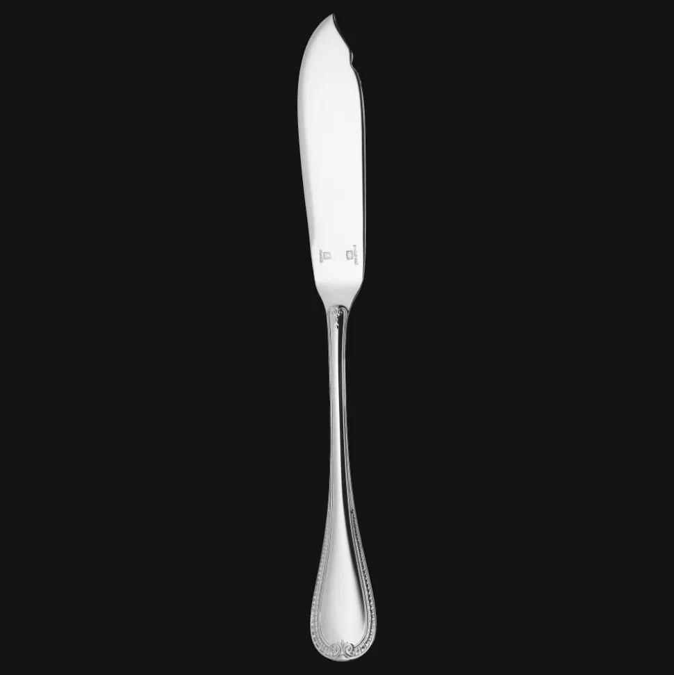 Couteau à poisson en métal argenté. Combiné à la fourchette à poisson, il est utile pour détacher la chair de poisson des arrêtes et la soulever.