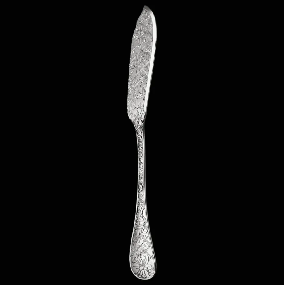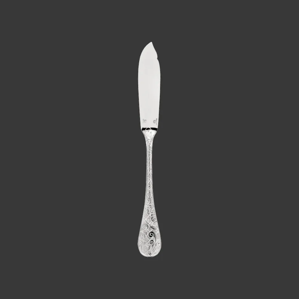 Couteau à poisson en métal argenté. Combiné à la fourchette à poisson, il est utile pour détacher la chair de poisson des arrêtes et la soulever.