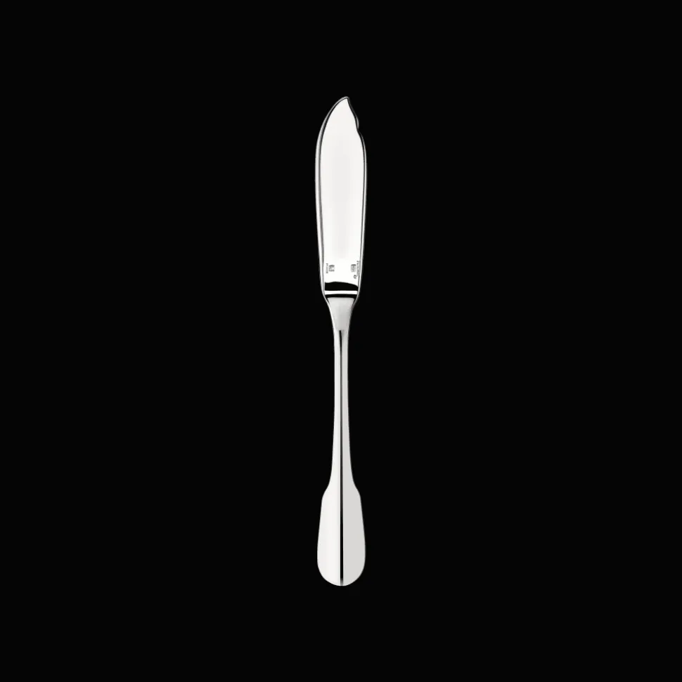 Couteau à poisson en métal argenté. Combiné à la fourchette à poisson, il est utile pour détacher la chair de poisson des arrêtes et la soulever.