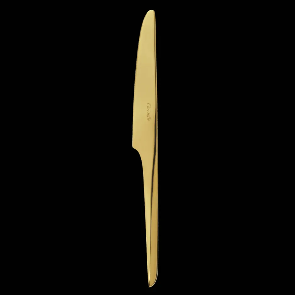 Couteau de table en acier de la collection L’Âme de Christofle en coloris or. Près de 10 ans après le lancement de « L’Âme de Christofle », la Maison nous convie à un nouveau voyage tout en couleur autour de nouvelles créations. De nouvelles couleurs – obtenues par une application d’alliages de métaux colorés sur la surface des pièces – viennent sublimer la ligne pure des couverts et apporter une touche supplémentaire de modernité aux plus belles tables. L’ÂME DE FEU, pour le coloris cuivre L’ÂME D’OR, pour le coloris or L’ÂME NOIRE, pour le coloris noir Chaque couleur reflète un état d’esprit particulier et permet d’ouvrir le jeu des objets, chacun peut y trouver son humeur et sa personnalité. Recommandations d’entretien : Vos couverts en acier se nettoient aussi bien à la main qu’au lave-vaisselle Utilisation du lave-vaisselle : Entrouvrir la porte dès la fin du cycle pour éviter les tâches de condensation et essuyer les pièces à l’aide d’un chiffon doux si nécessaire.