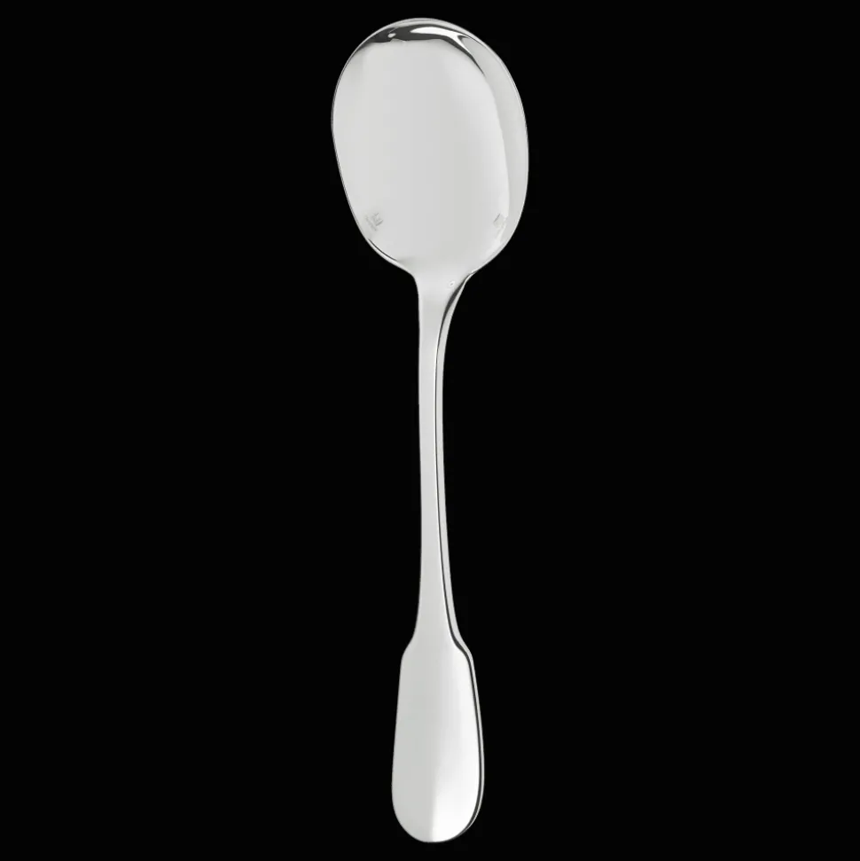 Cuillère à consommé en métal argenté, dont la forme est adaptée à celle du bol à consommé.