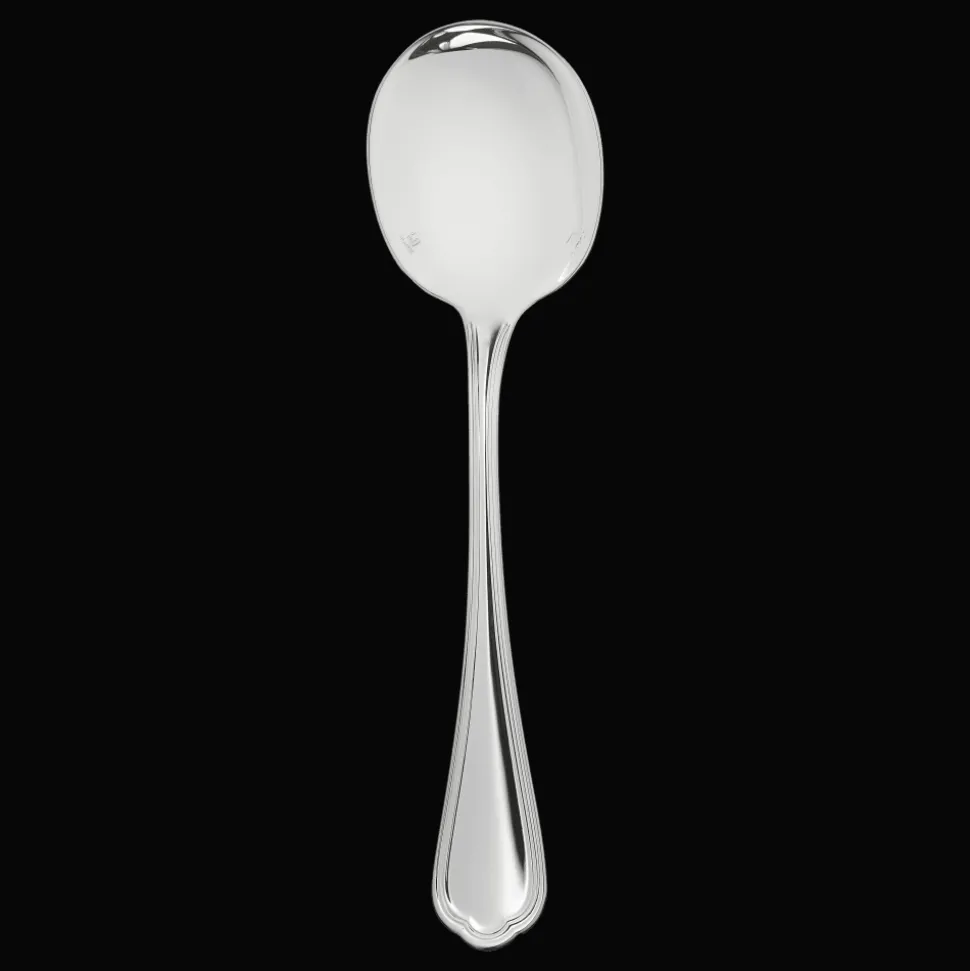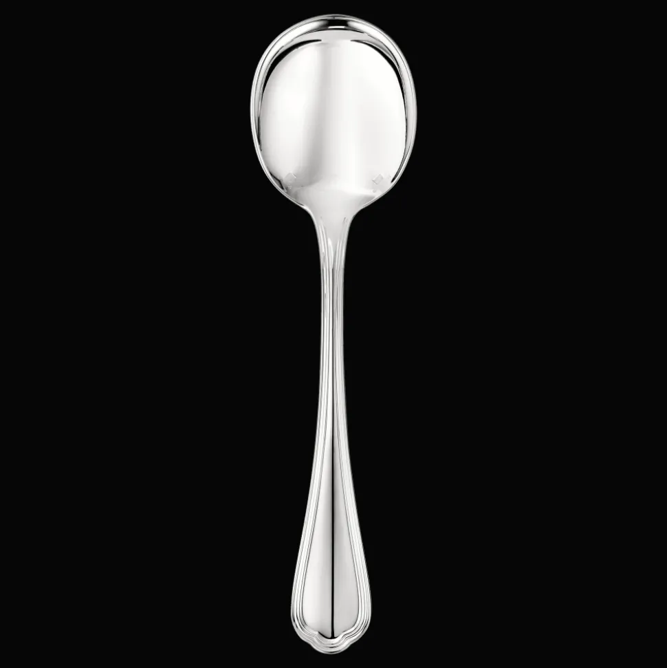 Cuillère à consommé en métal argenté, dont la forme est adaptée à celle du bol à consommé.