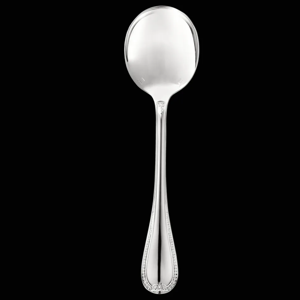 Cuillère à consommé en métal argenté, dont la forme est adaptée à celle du bol à consommé.