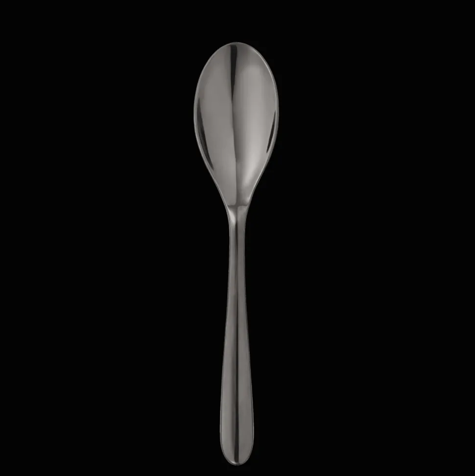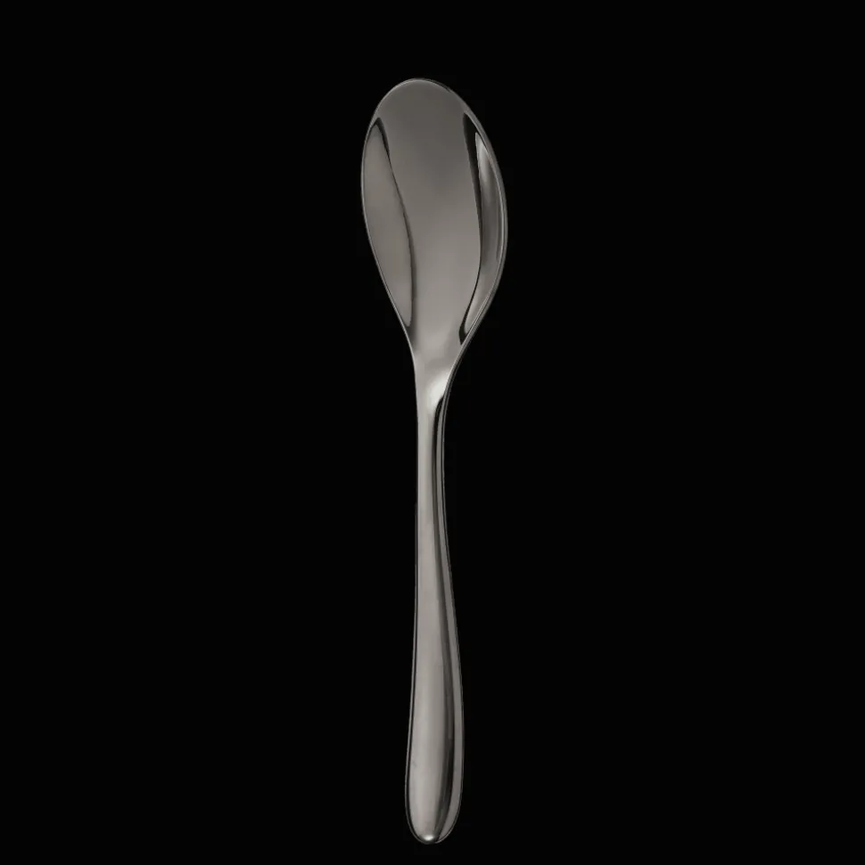 Cuillère à soupe en acier de la collection L’Âme de Christofle en coloris noir. Près de 10 ans après le lancement de « L’Âme de Christofle », la Maison nous convie à un nouveau voyage tout en couleur autour de nouvelles créations. De nouvelles couleurs – obtenues par une application d’alliages de métaux colorés sur la surface des pièces – viennent sublimer la ligne pure des couverts et apporter une touche supplémentaire de modernité aux plus belles tables. L’ÂME DE FEU, pour le coloris cuivre L’ÂME D’OR, pour le coloris or L’ÂME NOIRE, pour le coloris noir Chaque couleur reflète un état d’esprit particulier et permet d’ouvrir le jeu des objets, chacun peut y trouver son humeur et sa personnalité. Recommandations d’entretien : Vos couverts en acier se nettoient aussi bien à la main qu’au lave-vaisselle Utilisation du lave-vaisselle : Entrouvrir la porte dès la fin du cycle pour éviter les tâches de condensation et essuyer les pièces à l’aide d’un chiffon doux si nécessaire.