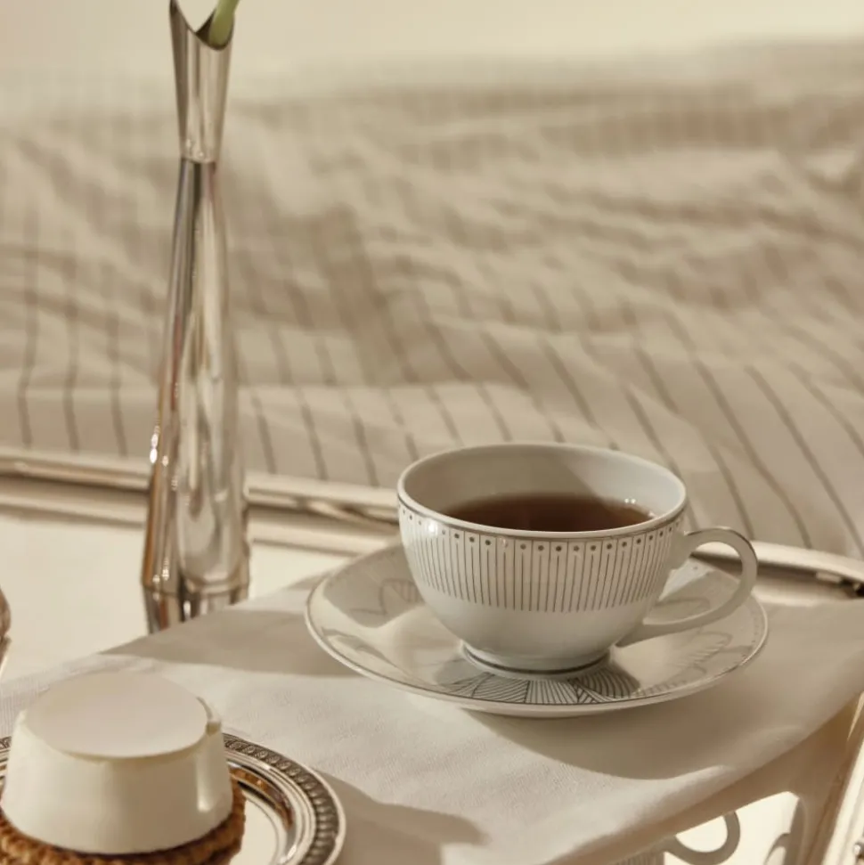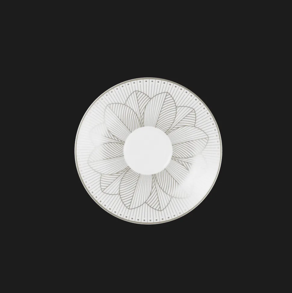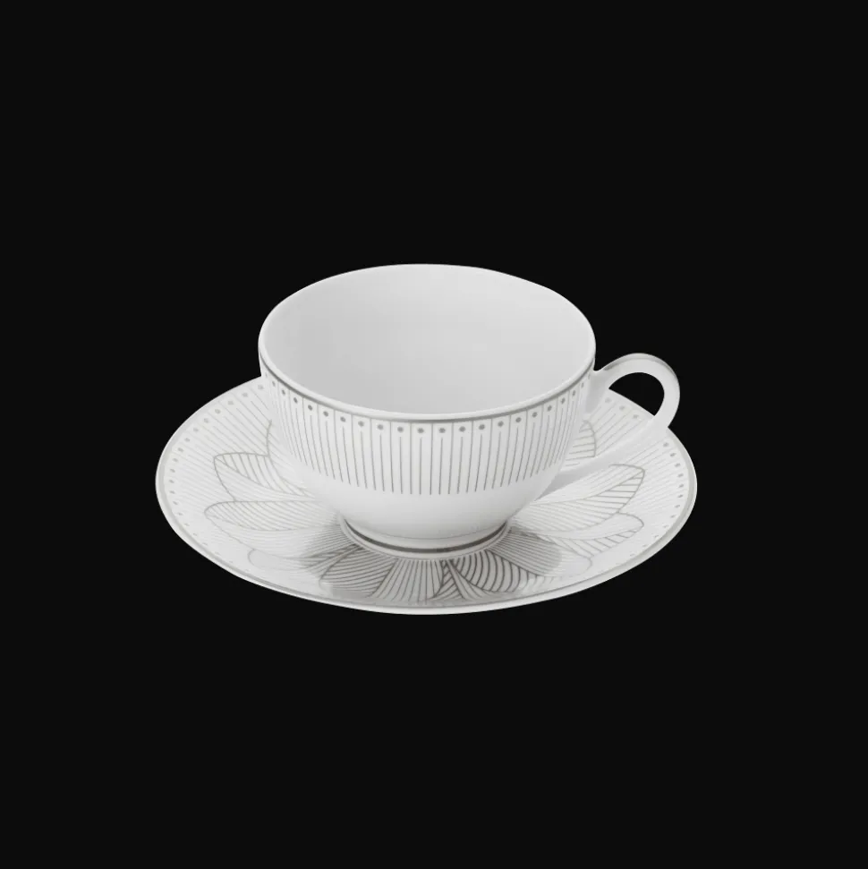 Tasses à café et soucoupes en porcelaine de Limoges avec décor en platine. Le décor réinterprète les codes identitaires de la collection.