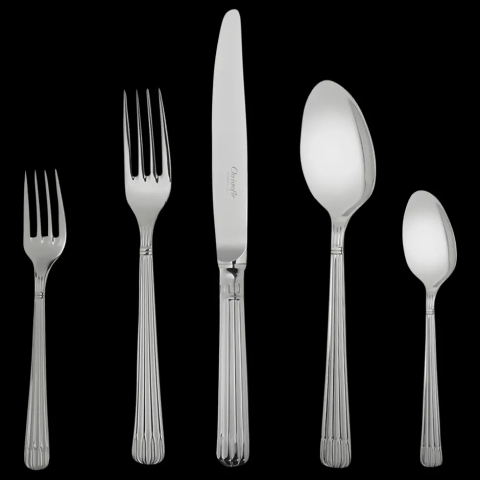 Ensemble 110 pièces pour 12 personnes de la collection Osiris, disposé dans un coffre. Cette ménagère est composée de : 12 Fourchettes Table, 12 Couteaux Table, 12 Cuillères Table, 12 Cuillères à Café, 12 Fourchettes à Dessert, 12 Couteaux à Dessert, 12 Cuillères à Dessert, 12 Fourchettes à Poisson, 12 couteaux à Poisson, 1 cuillère de Service, 1 Fourchette de Service. Le coffre est doublé d’un tissu anti-oxydant pour protéger l’argent de l’oxydation.