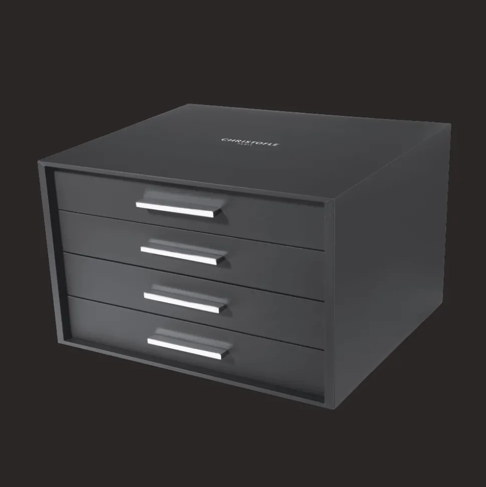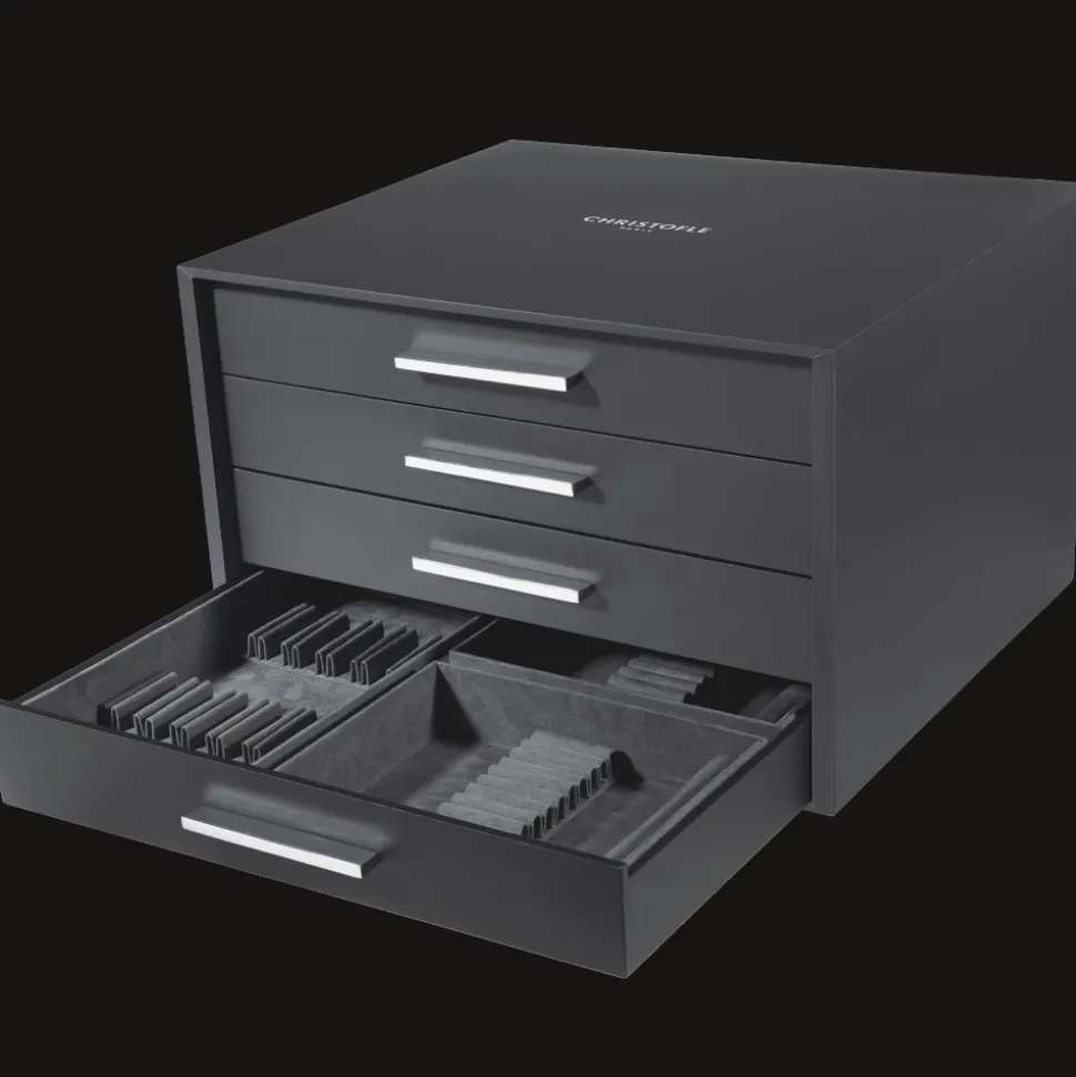 Ensemble 110 pièces pour 12 personnes disposé dans son coffre. Cette ménégère est composée de : 12 Fourchettes Table, 12 Couteaux Table, 12 Cuillères Table, 12 Cuillères à Café, 12 Fourchettes à Dessert, 12 Couteaux à Dessert, 12 Cuillères à Dessert, 12 Fourchettes à Poisson, 12 Couteaux à Poisson, 1 Cuillère à Servir, 1 Fourchette à Servir.