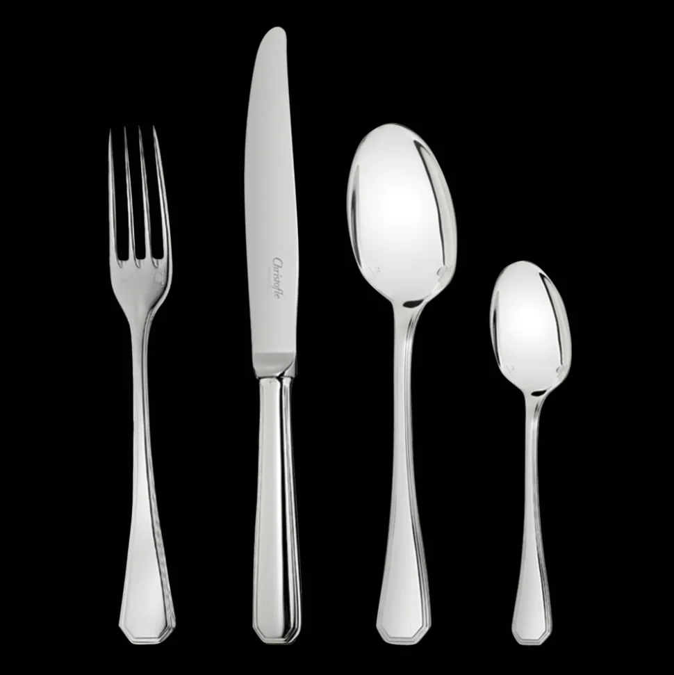 Cet ensemble de 48 pièces pour 12 personnes est disposée dans sa boîte de rangement et se compose de : 12 Cuillères de table, 12 Fourchettes de table, 12 Couteaux de table, 12 Cuillères à café.