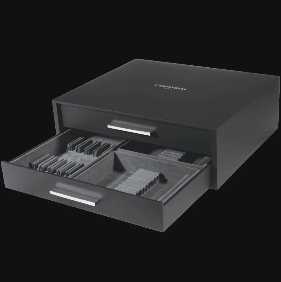 Ensemble de 75 pièces avec son coffre de rangement, pour 12 personnes se compose de : 12 Fourchettes table, 12 Couteaux table, 12 Cuillères table, 12 Fourchettes à dessert, 12 Couteaux à dessert, 12 Cuillères à café, 2 Cuillère à servir, 1 Fourchette à servir.