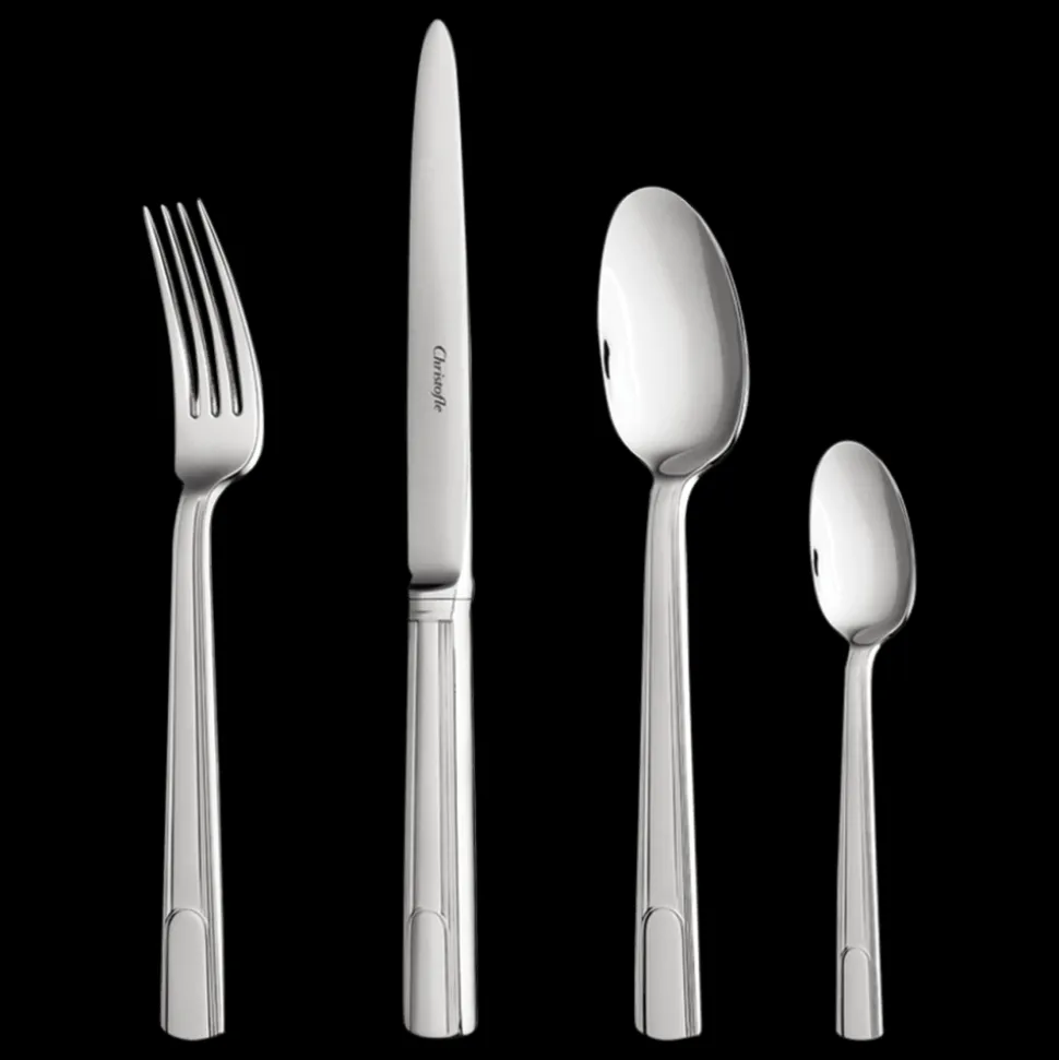 Cette ménagère appartient la collection Hudson. Crée en 1939, elle s’inspire du mouvement Art Déco par ses lignes pures et solides. Son architecture rigoureuse est soulignée par des filets s’étageant le long du manche des couverts.
