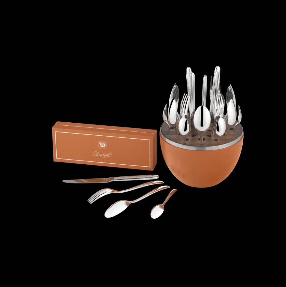 Set de 24 couverts en métal argenté, le MOOD by Christofle, par sa vision avant-gardiste d’une convivialité décomplexée, s’invite à toutes les tables comme une promesse de partage et d’émotion. Composition du set : 6 fourchettes de table, 6 couteaux de table, 6 cuillères de table, 6 cuillères à café. Socle intérieur en bois de noyer.