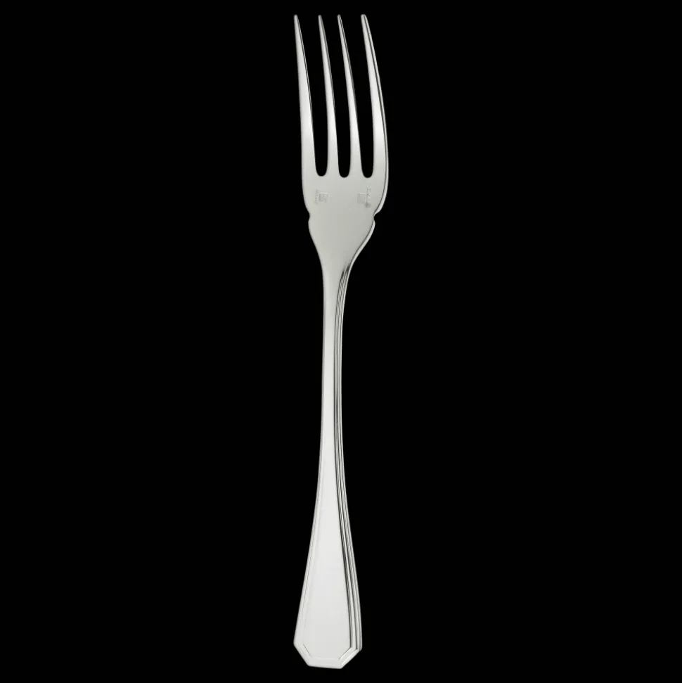 Fourchette à poisson en métal argenté. Combinée au couteau à poisson, elle est utile pour détacher la chair de poisson des arrêtes et la soulever.