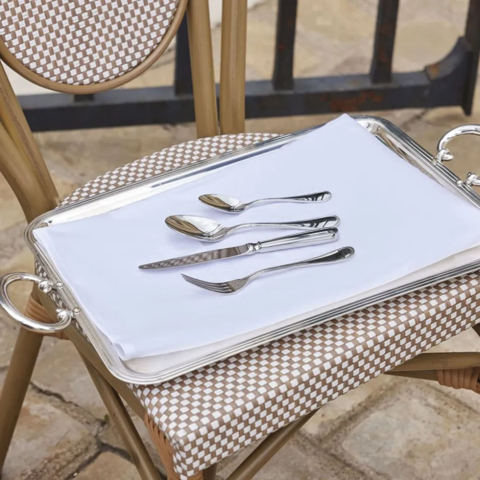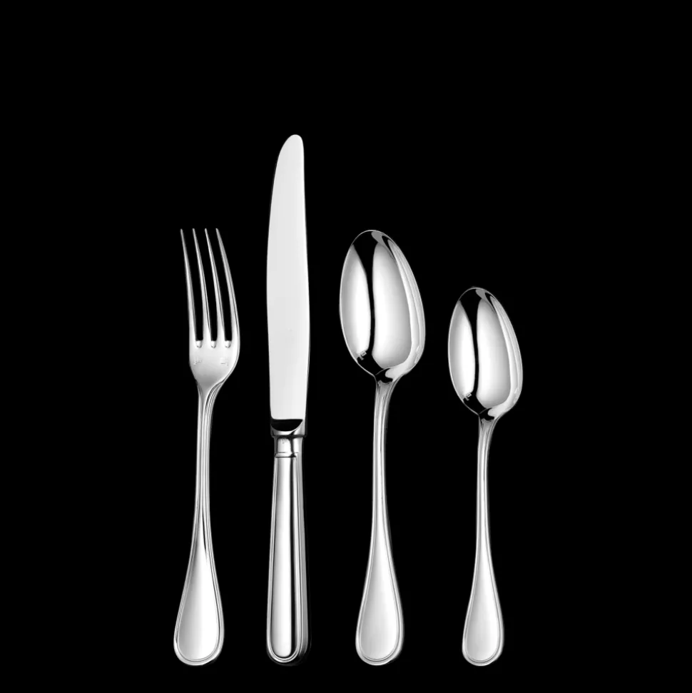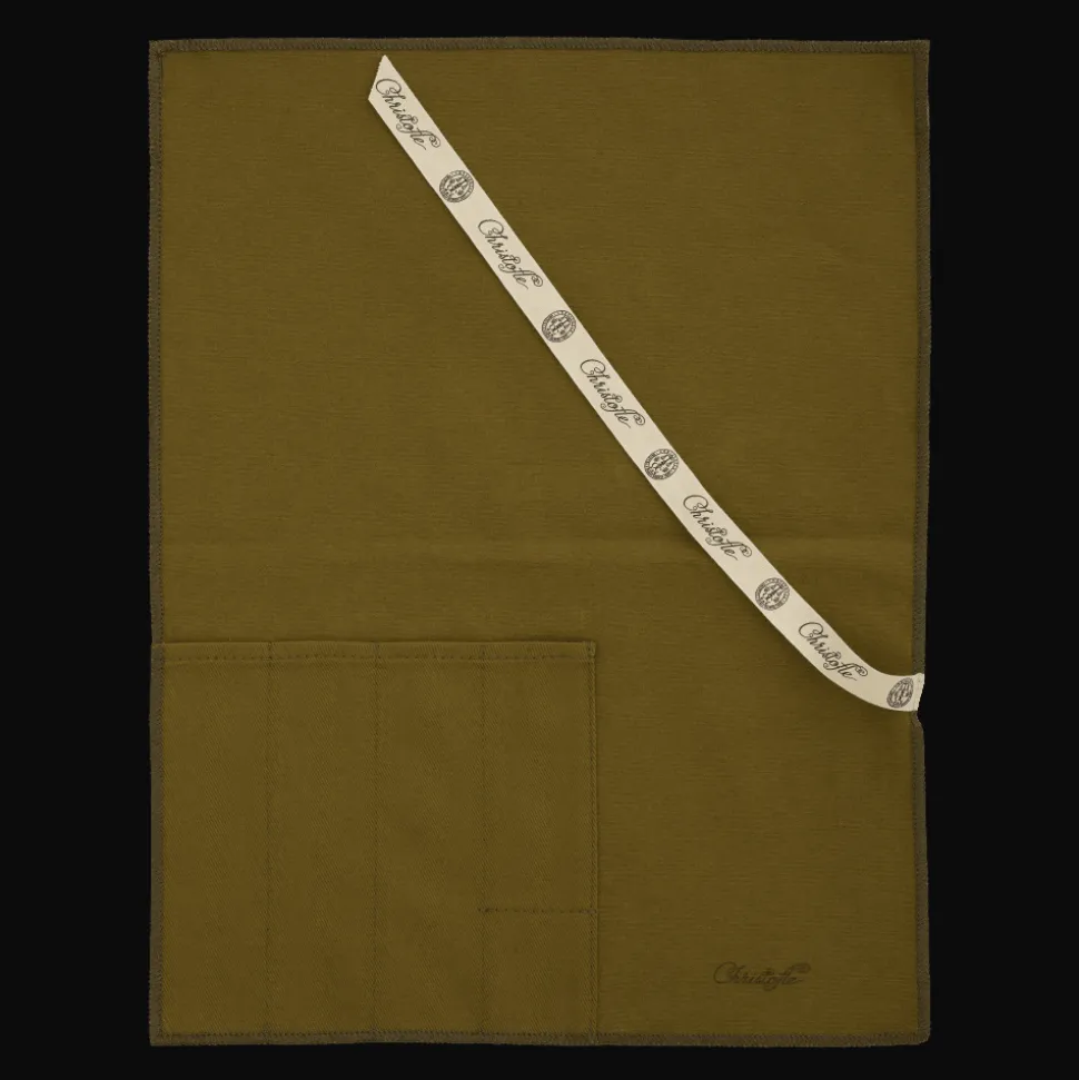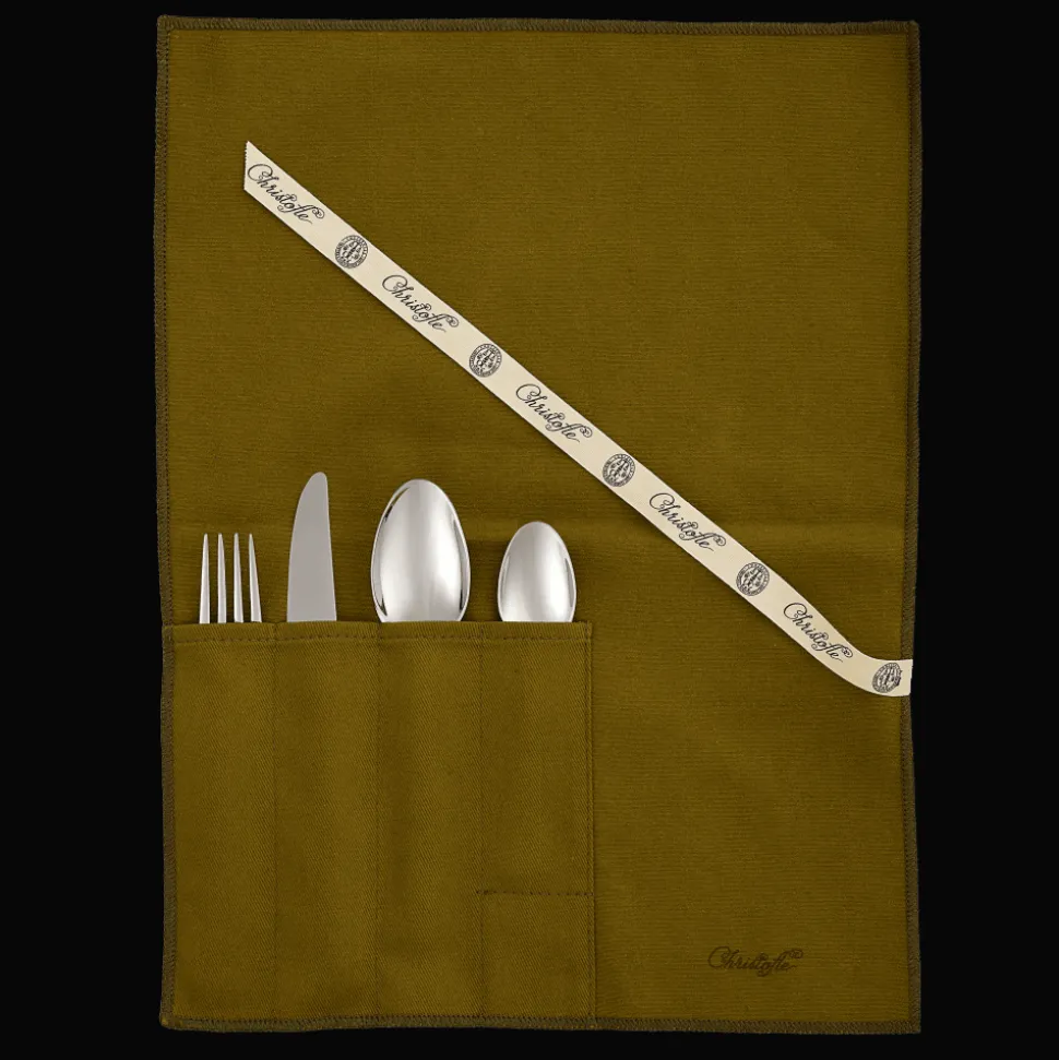 Inspirée des « pochettes d’usage » utilisées depuis toujours chez Christofle, La Trousse se compose de quatre couverts en acier de la : un couteau (19,6 cm), une fourchette (17 cm) et deux cuillères (une de 17,1 cm et une plus petite pour le café et les desserts de 13,5 cm), élégamment disposés dans un étui feutré Vert Impérial, couleur signature de la Maison, fermé par un ruban siglé.