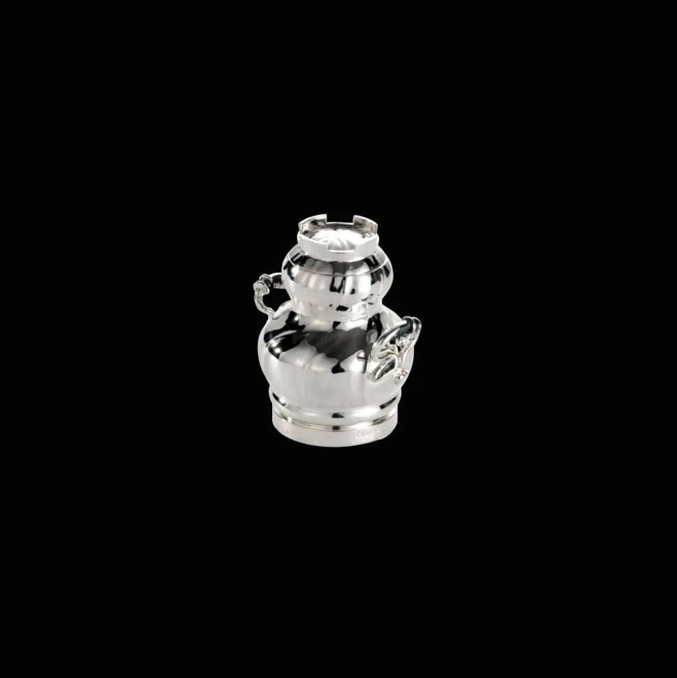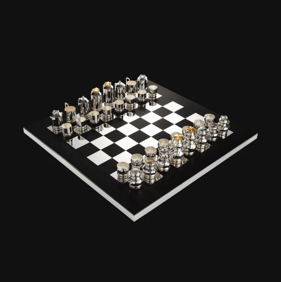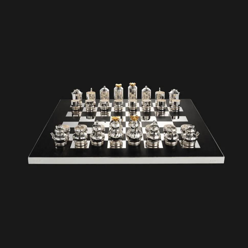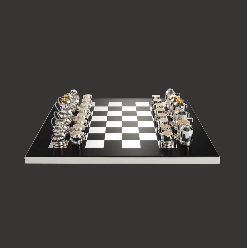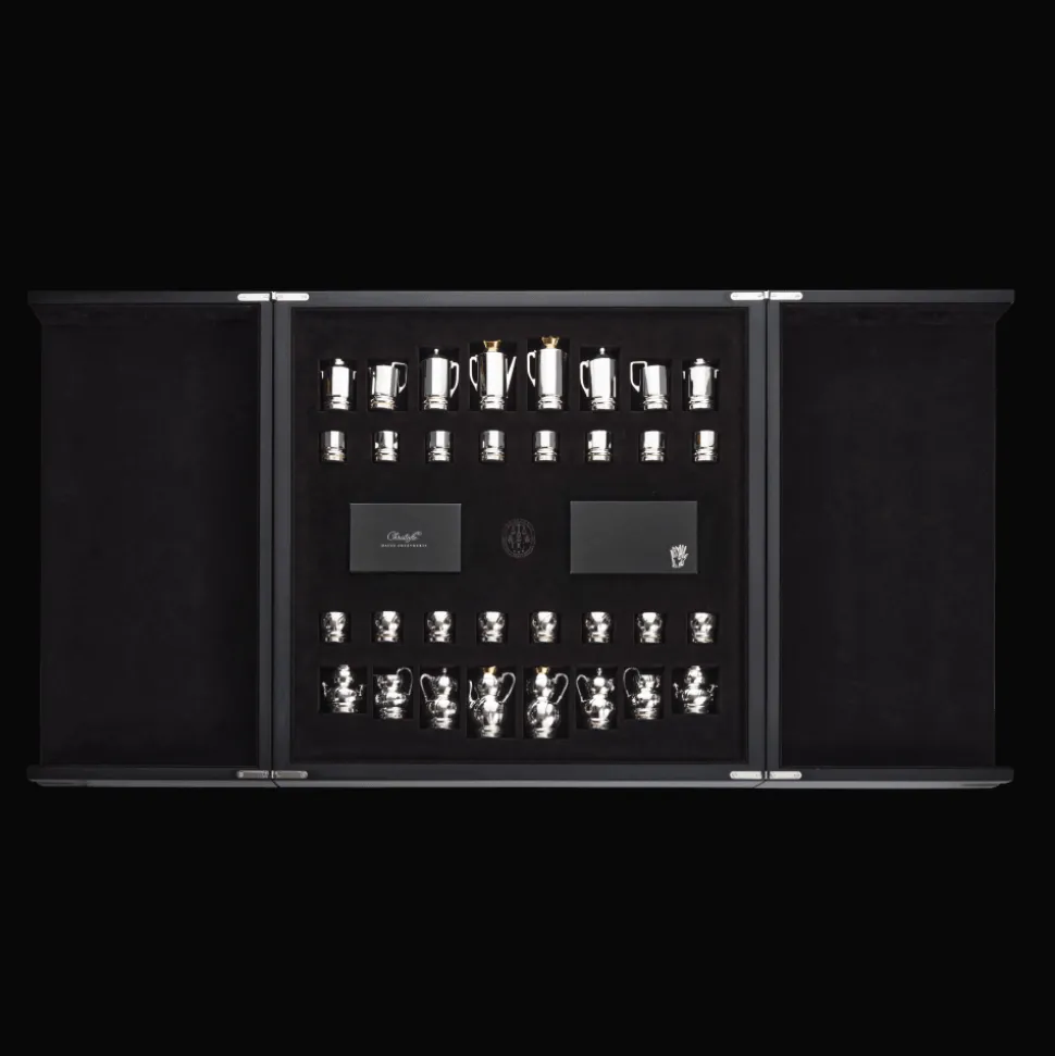 Les 32 pièces et pions en argent massif ont été réalisés à la main par les Maitres Orfèvres de l’atelier de Haute Orfèvrerie Christofle. Ici théières, crémiers, sucriers et tasses viennent remplacer les traditionnels rois et reines, fous, cavaliers, tours et pions ! Les rois et reines sont chapeautés d’une couronne de vermeil. Ces pièces sont dotées de finitions exceptionnelles : les couvercles s’ouvrent, les becs verseurs sont fonctionnels et les base des pièces est recouverte d’un patin de feutrine pour faciliter leur déplacement sur le plateau de jeu.