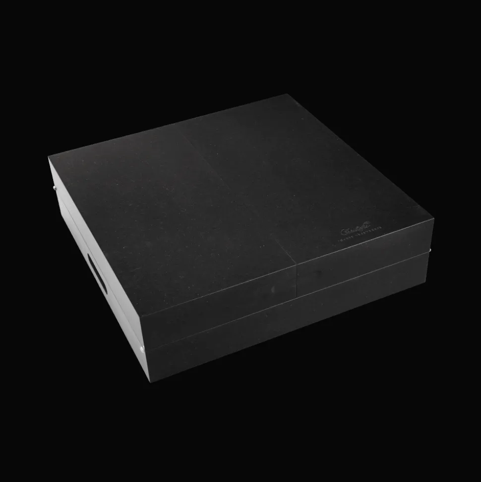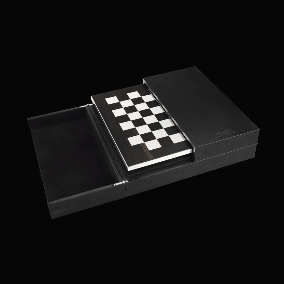 L’Echiquier est proposé dans un écrin en bois noir réalisé sur mesure en France. Entièrement recouvert de tissu anti-oxydant, il permet de ranger ou transporter cette pièce exceptionnelle. Edition limitée à 8 exemplaires.