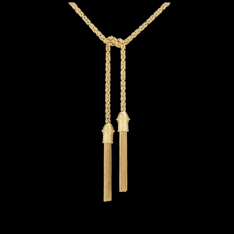 Long Sautoir à Nouer – Ceinture en argent massif doré 18 carats de la collection Pompon. La collection met à l’honneur un motif qui a une place à part dans l’histoire du costume, de la décoration et plus largement des arts décoratifs : le pompon. Ils sont créés sur une chaîne à maille byzantine, appelée aussi maille royale ou encore maille Péruvienne, « Cage à Oiseaux » ou « Dilemme du Fou » selon les continents et les époques. Cette chaîne souple se compose d’un enchevêtrement géométrique d’anneaux enfilés les uns aux autres suivant un motif précis et complexe. Les extrémités des chaînes byzantines se parent de gracieux pompons eux même constitués de fines chaînes vénitiennes. Le grand sautoir Pompon se porte de plusieurs façons : enroulé autour du cou, noué dans un esprit cravate, et même ceinturé autour de la taille, adaptez le selon vos envies et vos tenues. La chaîne byzantine propose un motif à la fois très élégant et féminin mais aussi solide et capable d’une grande souplesse. Ce design en argent massif dorée à l’or fin 18 carats est également mis en valeur dans sa version en argent massif.