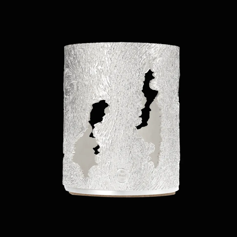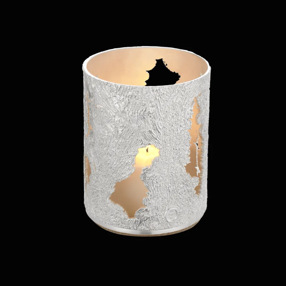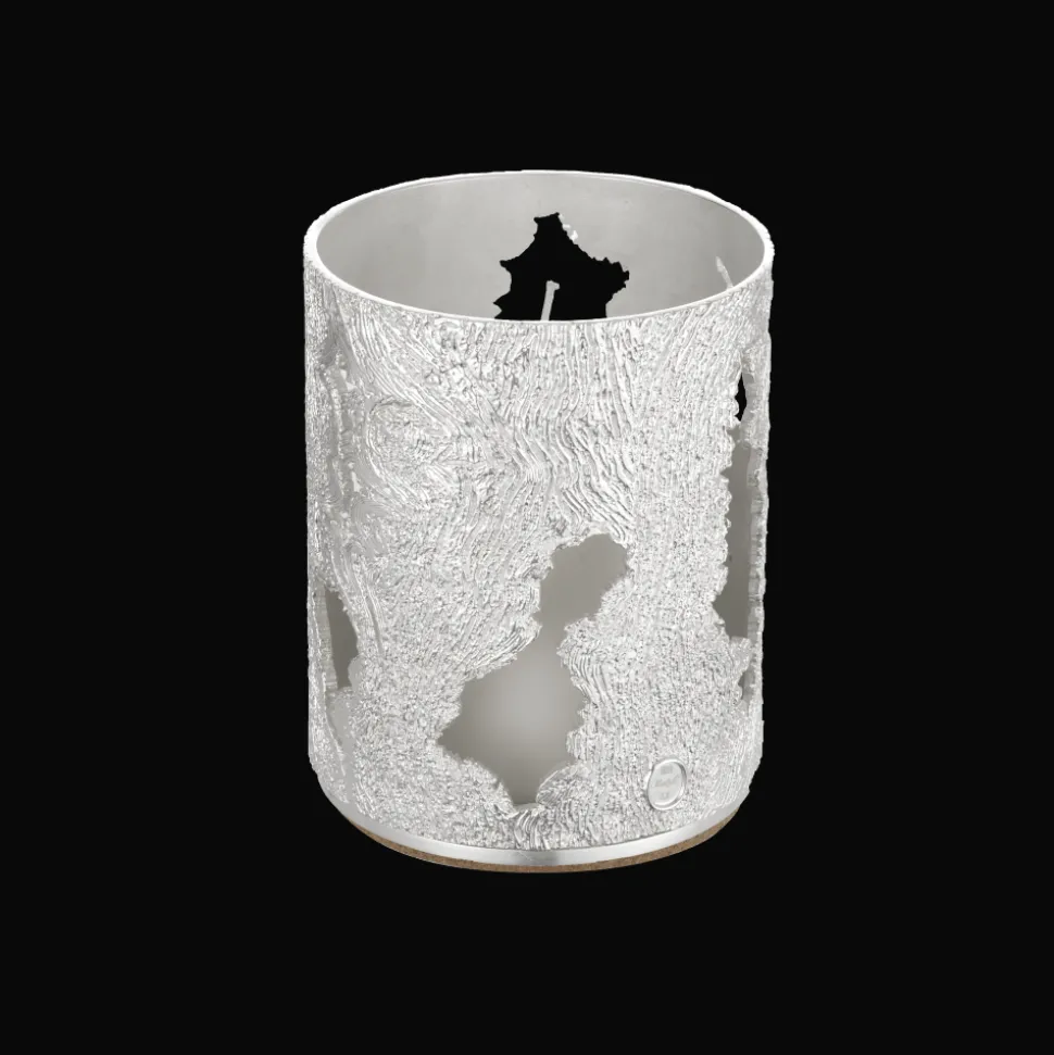 Le grand photophore est réalisé en fonderie, son décor inspiré de l’écorce de pin est mis en valeur par l’argent. Un travail d’ajourage dans l’écorce d’argent laisse traverser la lumière une fois votre bougie allumée. Les parties sont amovibles pour allumer et éteindre votre bougie en toute sécurité. Le socle d’argent acceuille une grande bougie fournie, lui même reposant sur un socle en liège pour protéger vos surfaces.