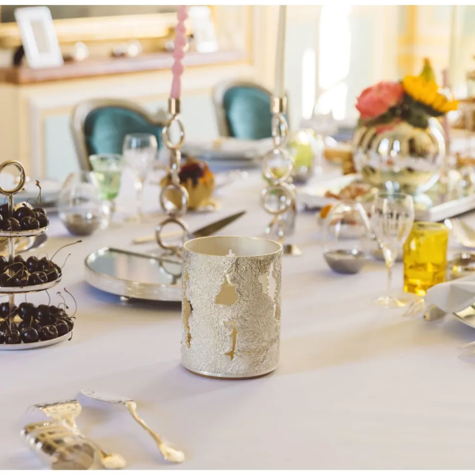 Le Surtout rassemble un bougeoir, un petit et un grand photophore, un petit vase, un soliflore et deux plateaux de formes différentes. Les motifs des lumières et des vases sont inspirés de la nature : écorces de bouleau, de pin et de châtaignier. Le Surtout apportera lumière et fraîcheur lors de célébrations, mais pas seulement. Il deviendra la pièce maîtresse de votre maison tout au long de l’année.