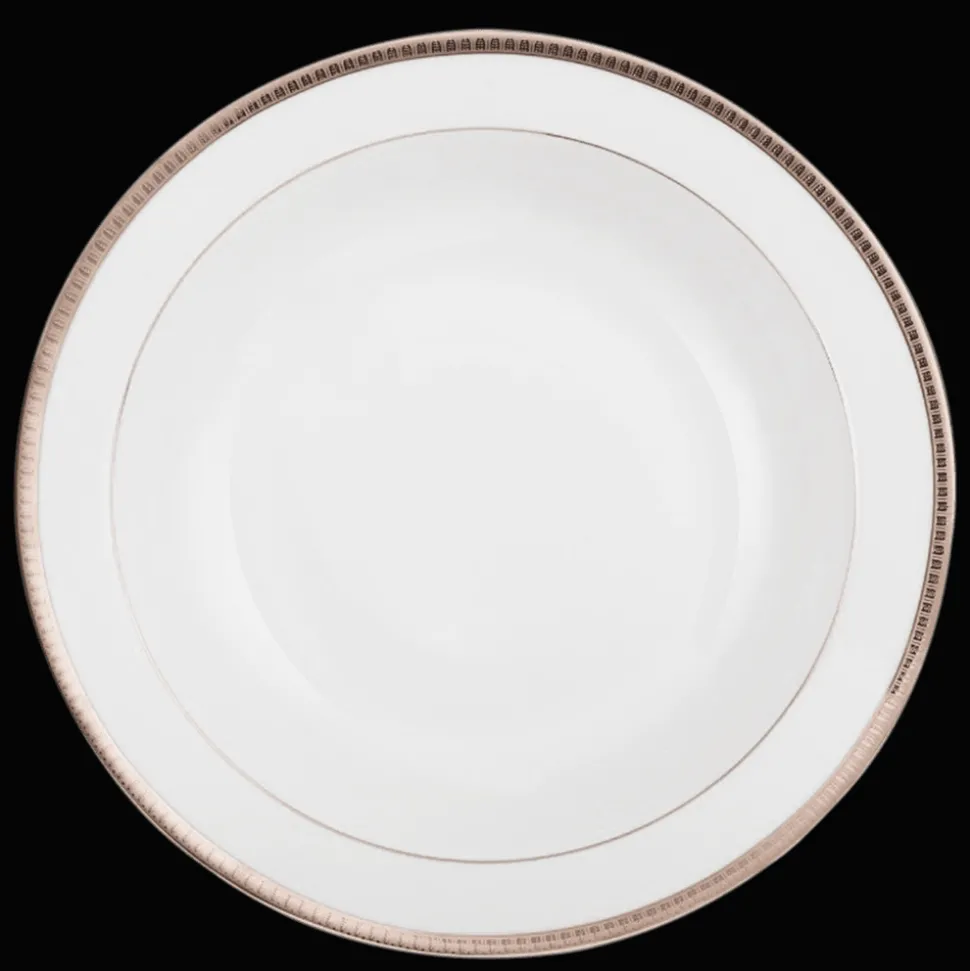 Plat rond creux en porcelaine de Limoges filet platine pour une table élégante et signée. Le décor réinterprète les codes stylistiques de la collection Malmaison.