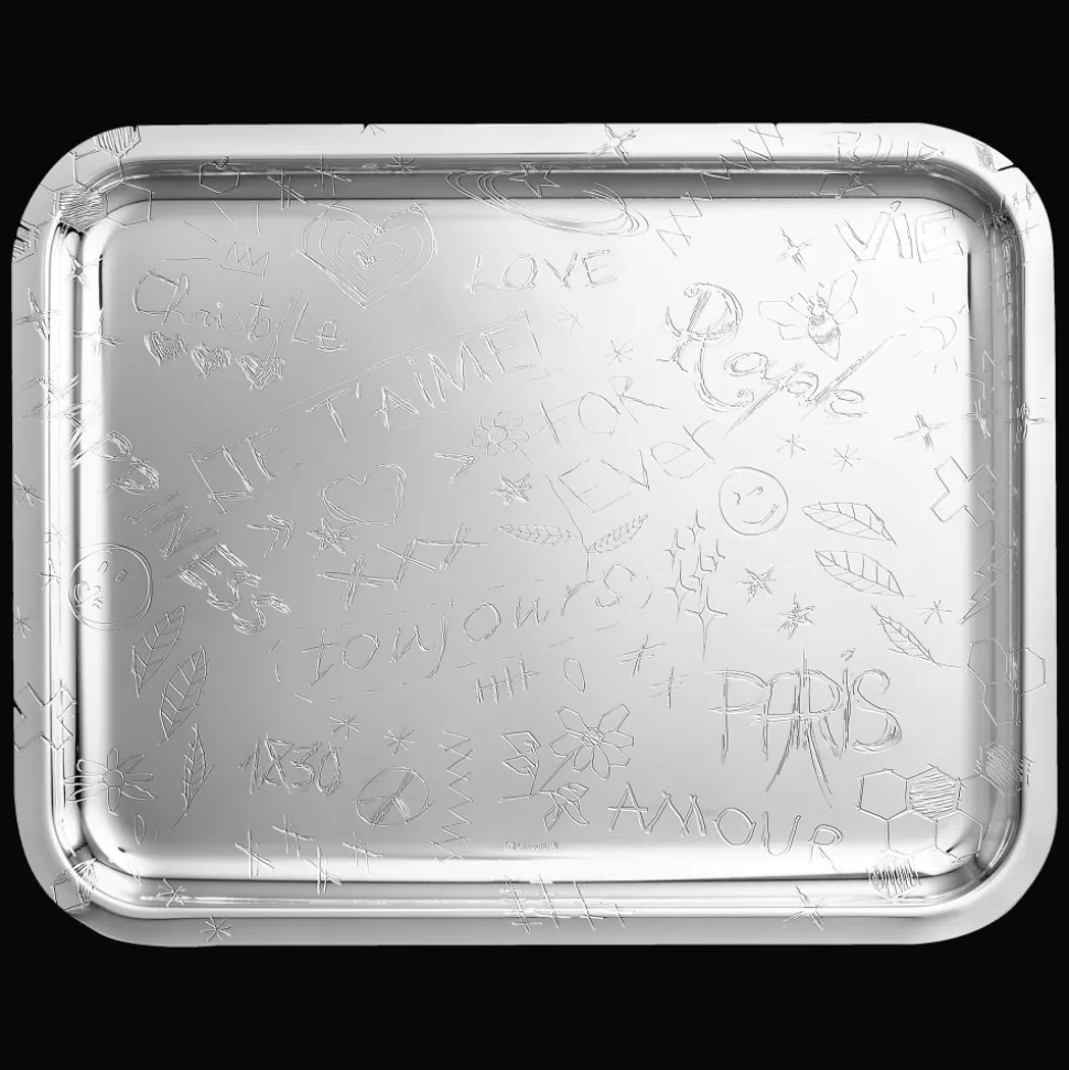 Plateau en métal argenté gravé du décor de la collection Graffiti. Un décor caractérisé par des messages ludiques et décalés mais aussi par les codes forts de la Maison Christofle. Le format de ce plateau le rend idéal pour le service lors de cocktails. Contemporaine, légère et ludique, la collection GRAFFITI a été conçue par l’agence de design « la tête au cube » pour Christofle.