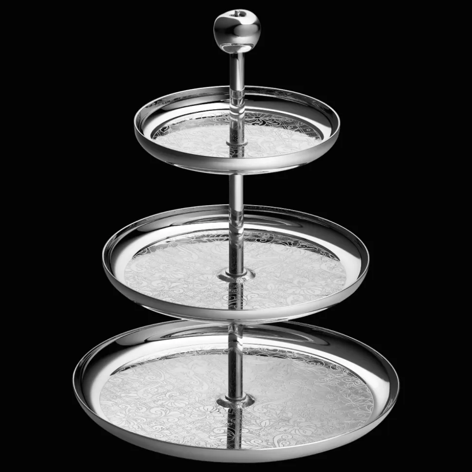 Porte-mignardises à 3 compartiments en métal argenté. Accessoire de table pour présenter petits fours et gourmandises sucrées au moment du thé. Le décor reprend les codes stylistiques de la collection.