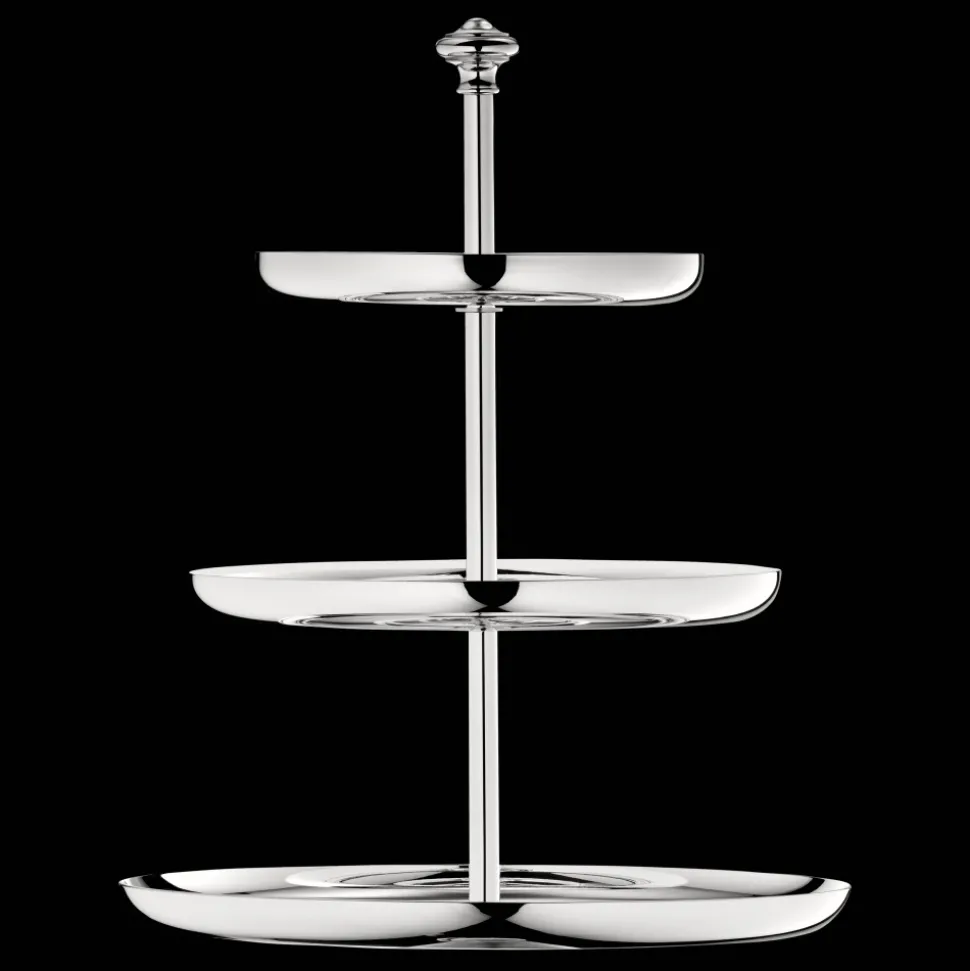 Porte-mignardises à 3 compartiments en métal argenté. Accessoire de table pour présenter petits fours et gourmandises sucrées au moment du thé. Le décor reprend les codes stylistiques de la collection.