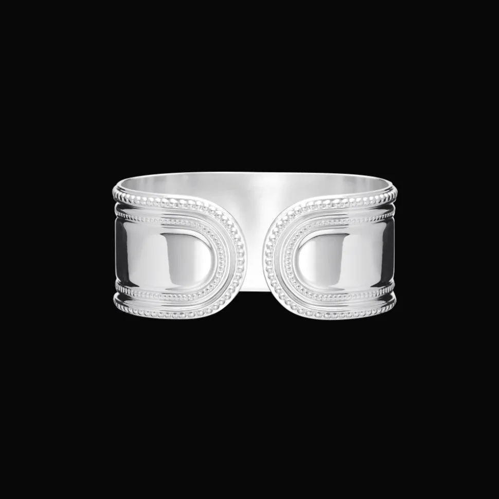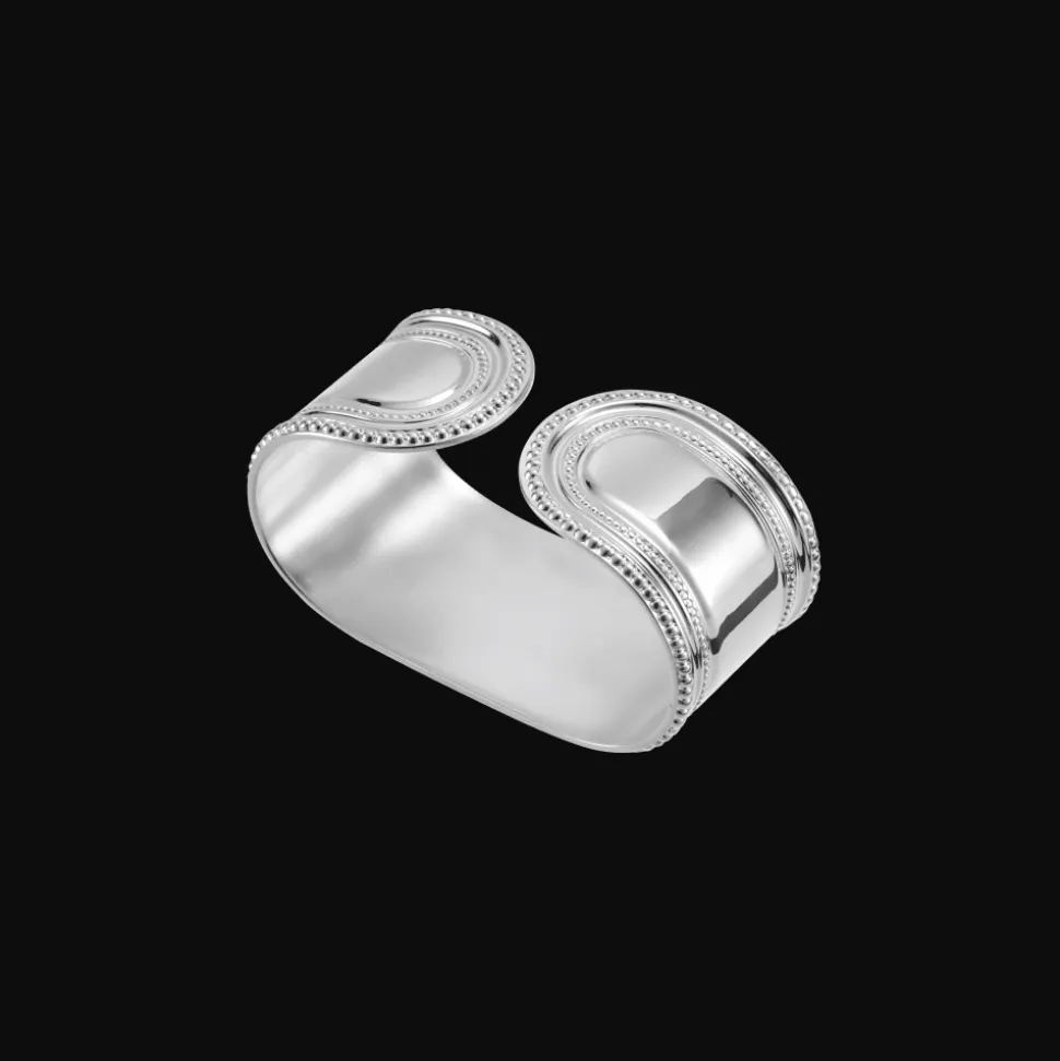 Ce rond de serviette en métal argenté est ouvert et orné d’un filet de Perles. Il est personnalisable grâce à notre service de gravure.