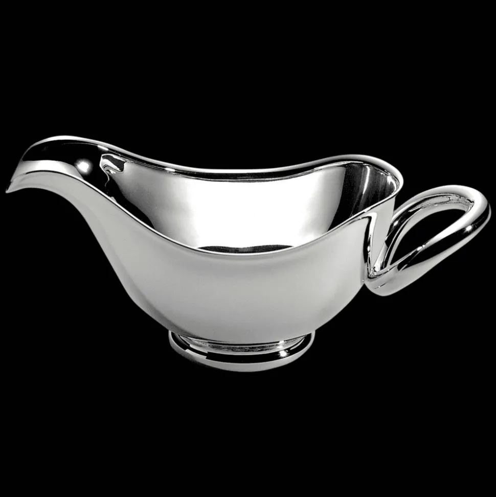 Saucière en métal argenté. Accessoire de table idéal pour une présentation élégante à table des sauces. Le décor reprend les codes stylistiques de la collection.