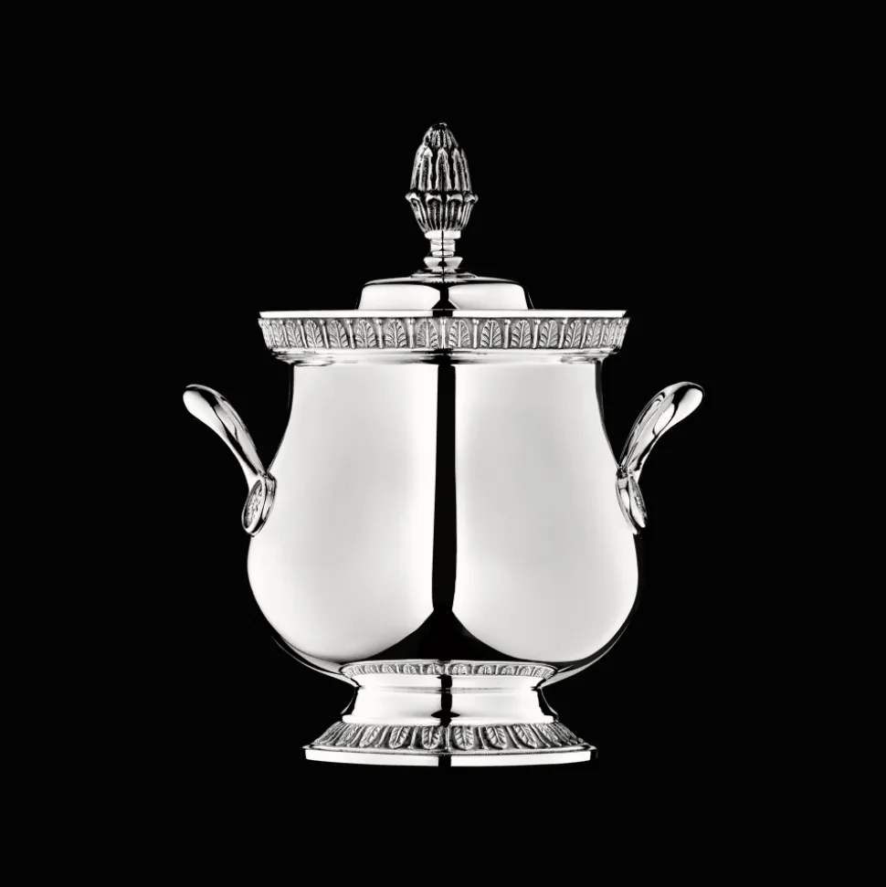 Sucrier en métal argenté. A assortir avec les autres pièces du service à thé ou café pour une table de petit-déjeuner élégante et signée. Le décor reprend les codes stylistiques de la collection.
