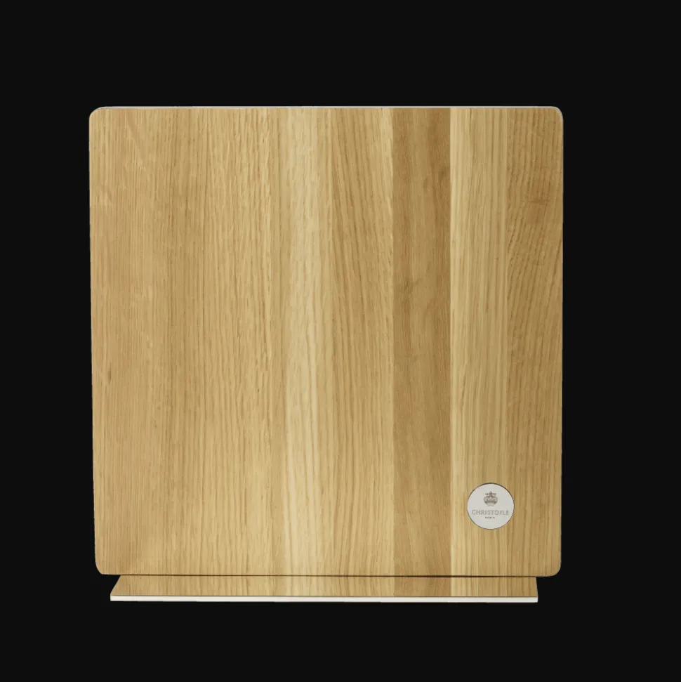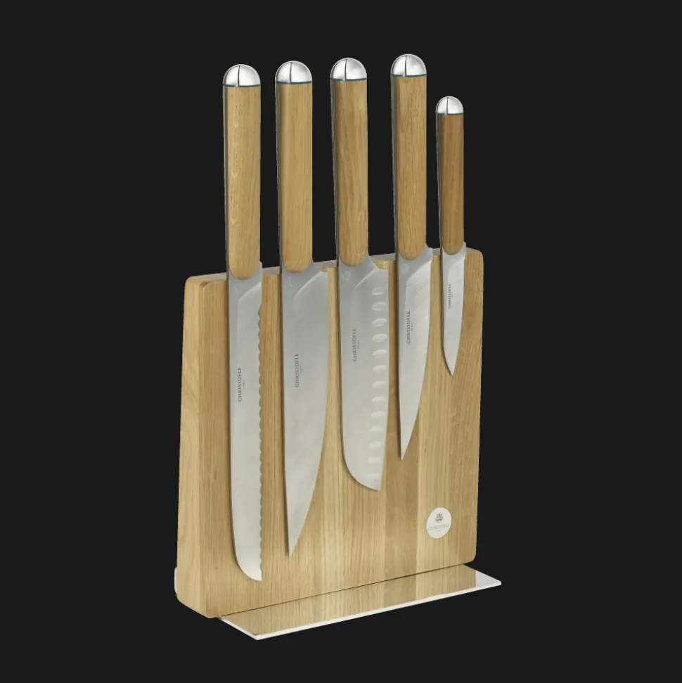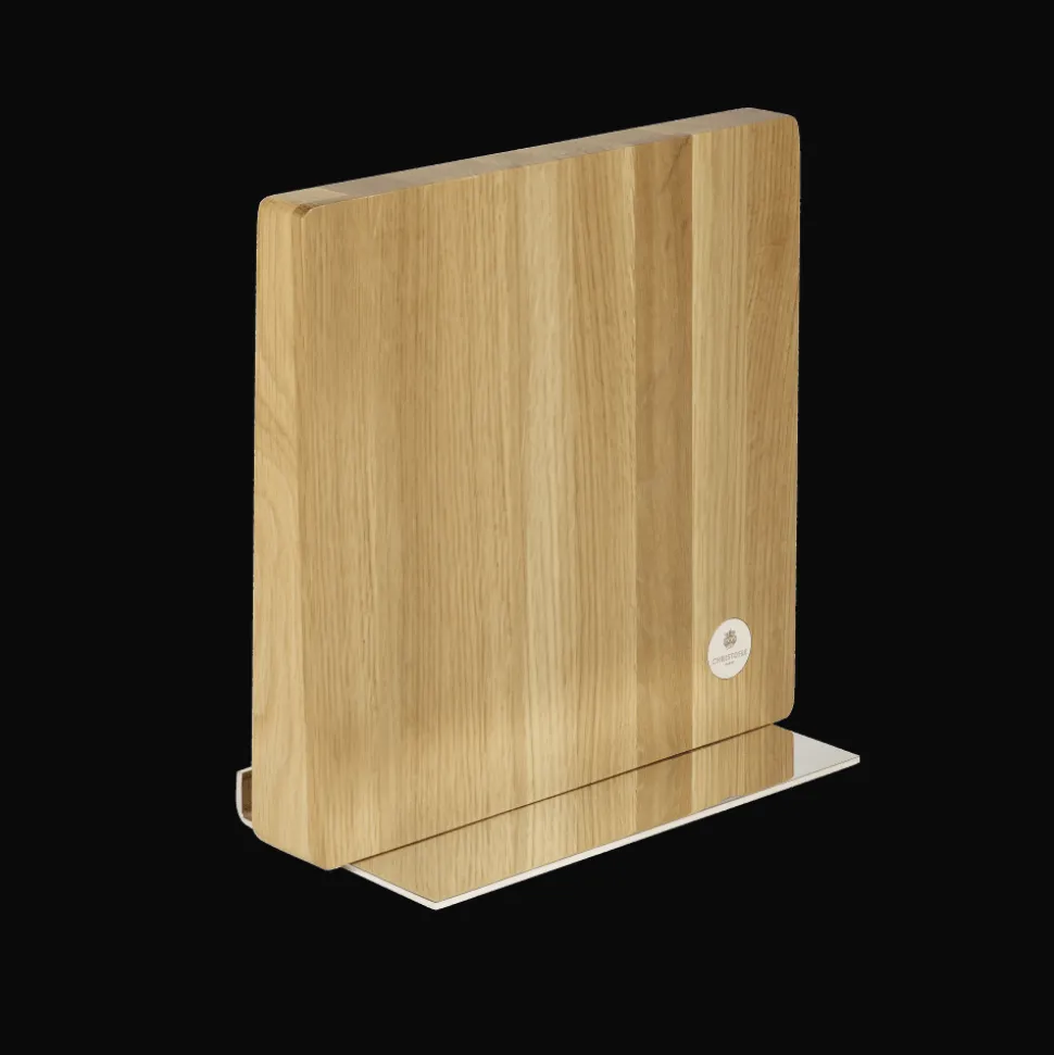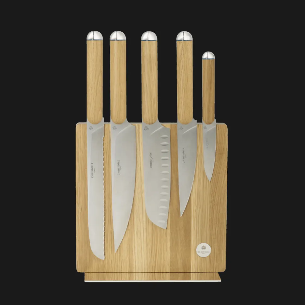 Les couteaux de la collection Royal Chef s’aimantent sur ce support en chêne massif et métal argenté assorti, dont la particularité est de pouvoir également accueillir une tablette ou un livre pour y lire une recette… Cette pièce en chêne massif réalisée dans une facture brute et authentique rappelle la tradition de solidité chère à Christofle. Le pied en métal argenté est amovible afin d’en faciliter l’entretien. Fidèle à ses valeurs d’ingéniosité et d’audace créative, Christofle surprend une nouvelle fois par son sens de l’innovation. S’inspirant des nouveaux modes de vie, la Maison bouscule les codes du luxe traditionnel et y répond avec talent. Christofle revisite les façons de recevoir en s’introduisant désormais au coeur de l’intérieur contemporain où s’élaborent les repas. La préparation des réjouissances gustatives est aujourd’hui un moment-clé : chacun aime y participer, échanger et apporter sa touche personnelle… avec chic, grâce à de beaux objets Christofle. Un nouvel art du partage à vivre en famille et avec ses proches dans un espace ouvert et convivial. Ce support est vendu sans couteaux.