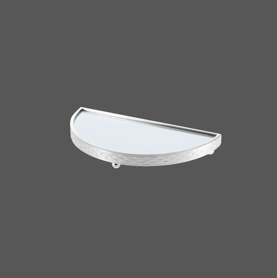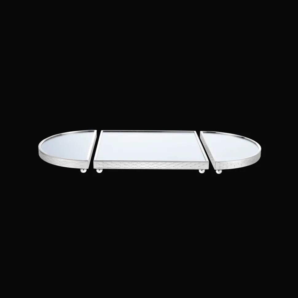 Le plateau en demi-cercle est légèrement surélevé et orné sur son pourtour d’un décor en métal argenté. Le fond du plateau est constitué d’un miroir reflétant la beauté des pièces qui peuvent y être posées. Ce jeu de lumières et de reflets d’argent composent un magnifique ensemble.