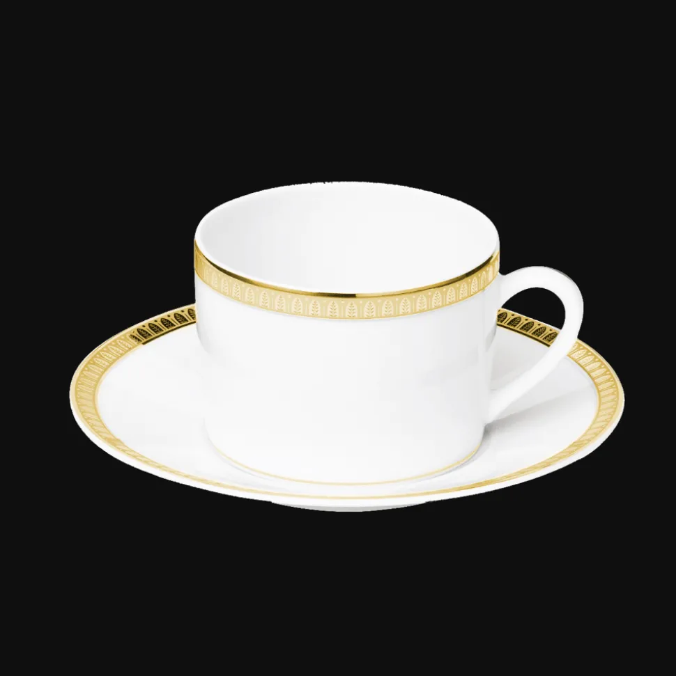 Tasse à thé avec soucoupe en porcelaine de Limoges dorée à l’or fin pour une table élégante et signée. Le décor réinterprète les codes identitaires de la collection Malmaison.