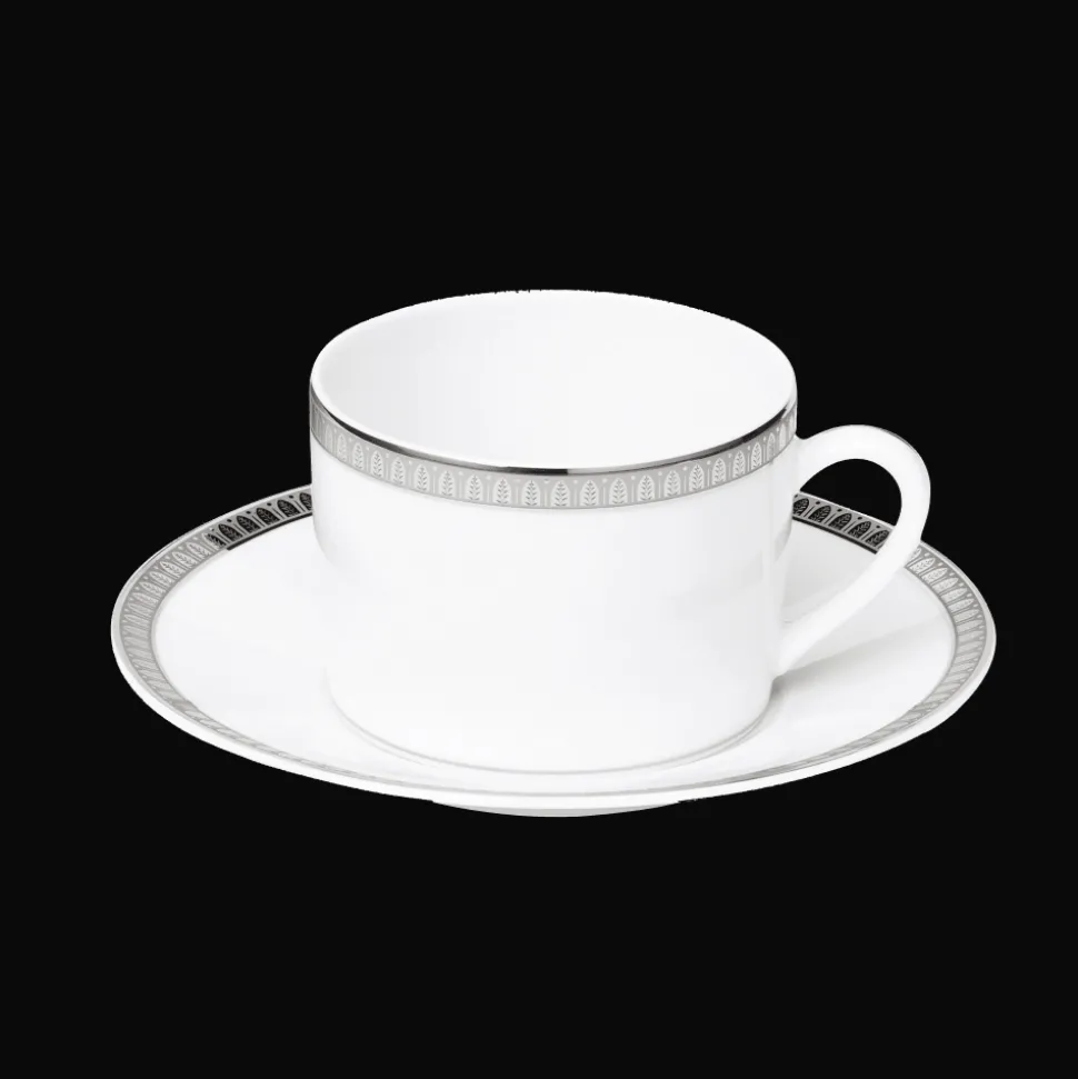 Tasse à thé avec soucoupe en porcelaine de Limoges filet platine pour une table élégante et signée. Le décor réinterprète les codes identitaires de la collection.