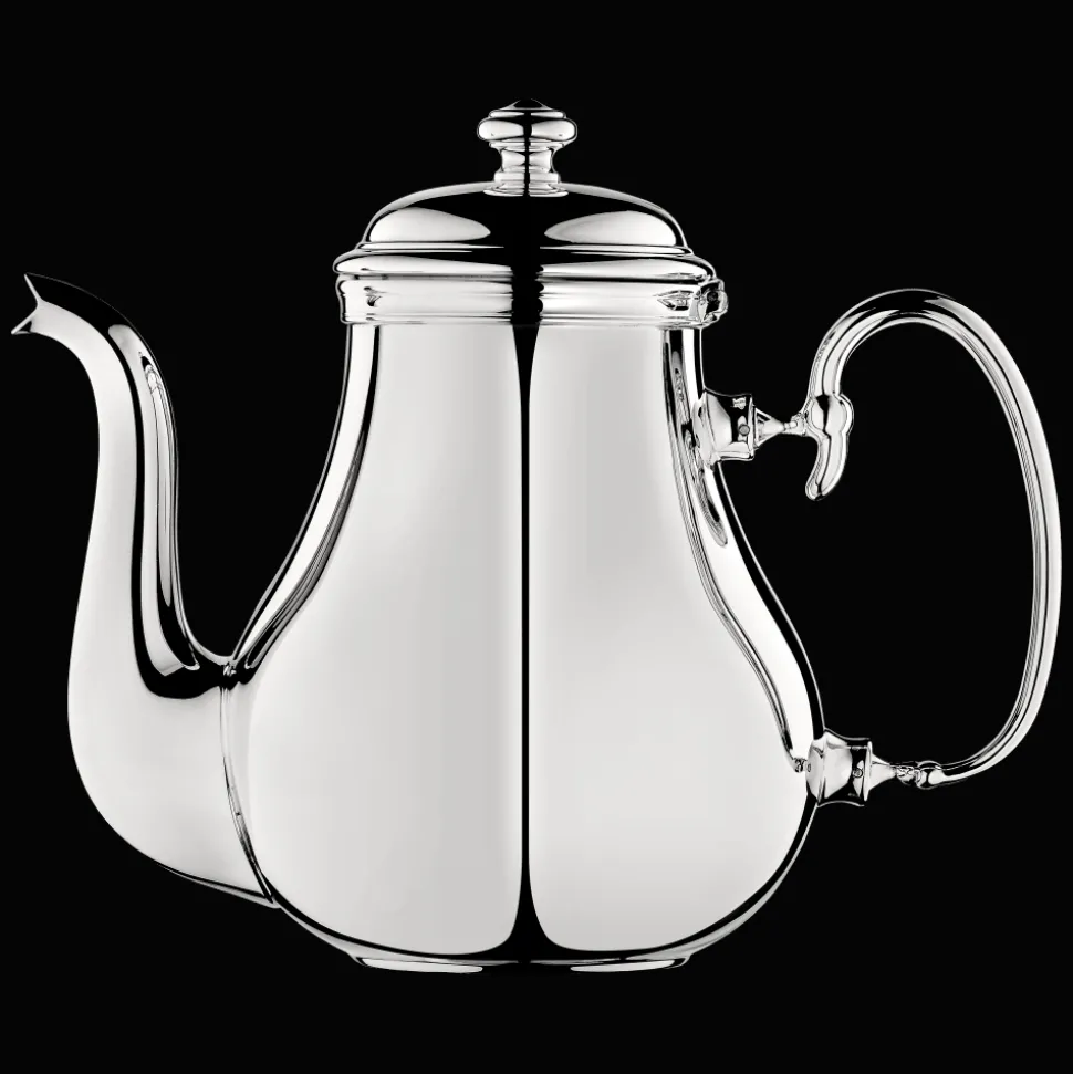 Théière en métal argenté. A assortir avec les autres pièces du service à thé ou café pour une table de petit-déjeuner élégante et signée. Le décor reprend les codes stylistiques de la collection.