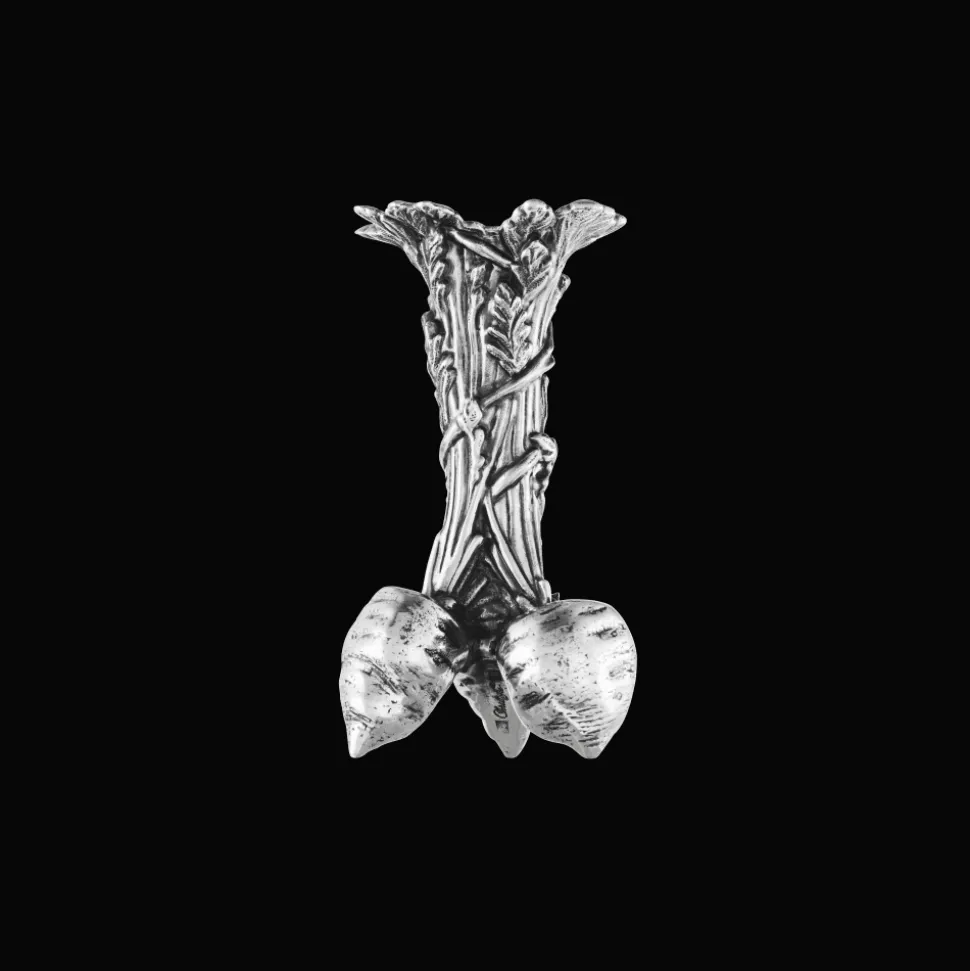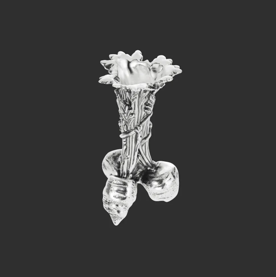 Ce vase représente une botte de carottes avec un réalisme étonnant, une infinité de détails dans l’ornementation et le feuillage. Ce vase de 10,5 cm de hauteur est en métal argenté patiné, une technique qui permet de faire ressortir les reliefs du décor pour un rendu ciselé.