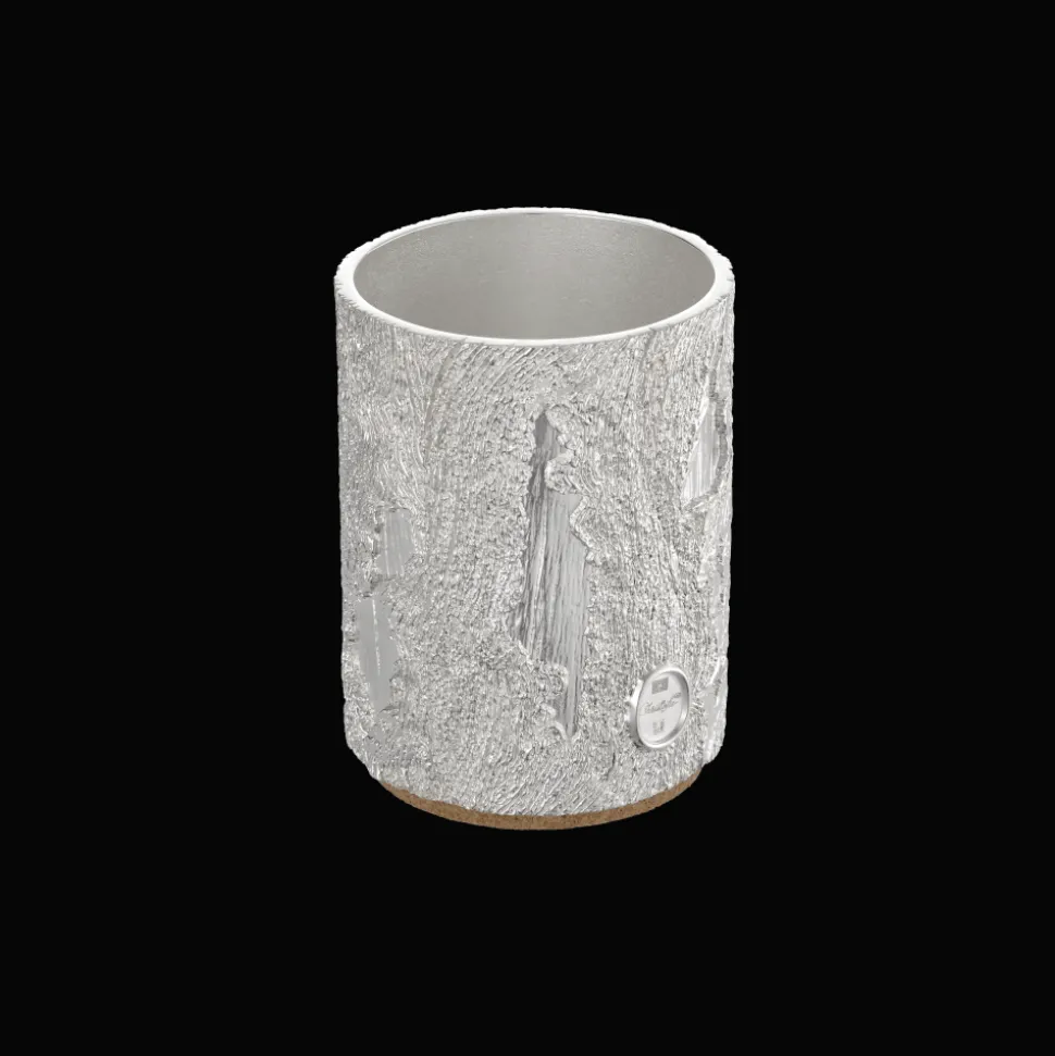 Le vase est réalisé en fonderie, son décor inspiré de l’écorce de pin est mis en valeur par l’argent. Il repose sur un socle en liège pour protéger vos surfaces.