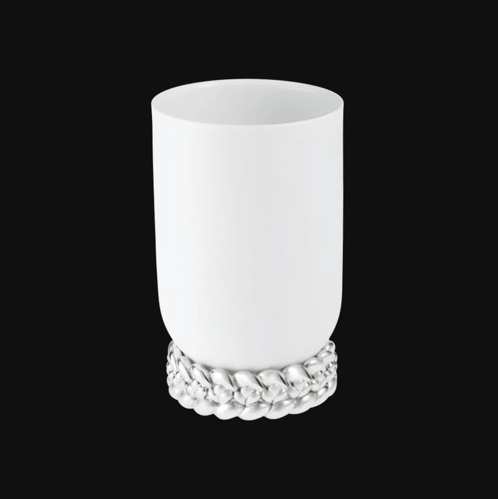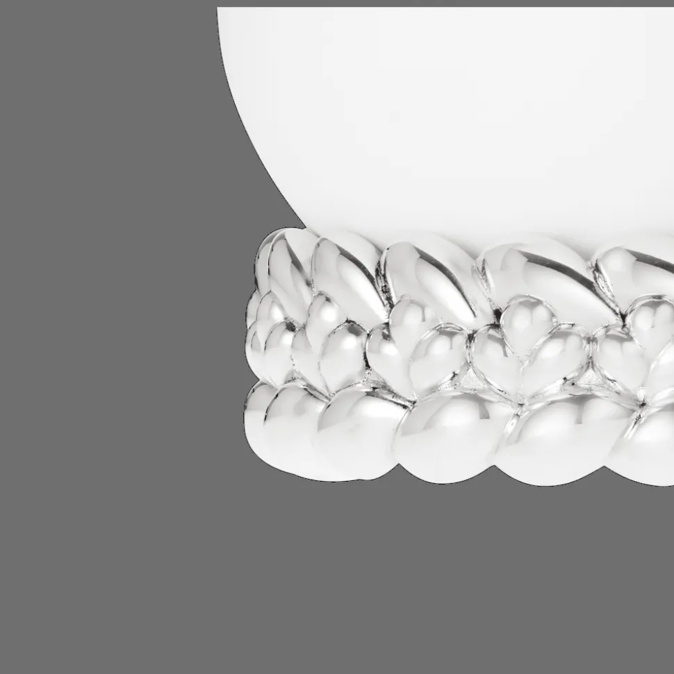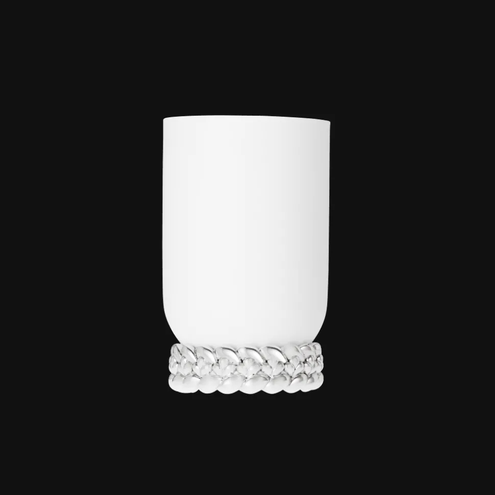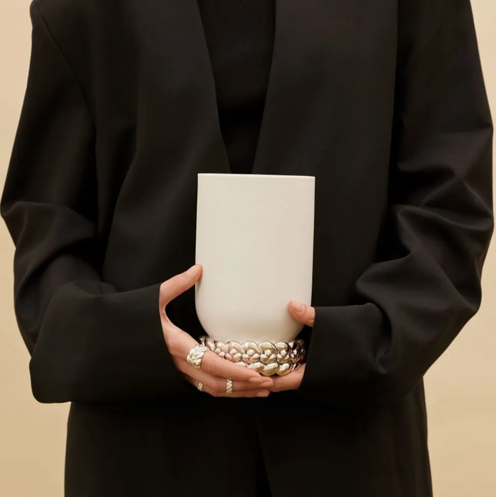 Ce vase en porcelaine, avec son intérieur émaillé et son extérieur mate, repose sur une base en métal argenté. La tresse patinée et généreuse contraste avec la pureté de la porcelaine. La base et le vase sont dissociables pour faciliter leur utilisation et leur entretien. Porcelaine fabriquée en France, à la main.